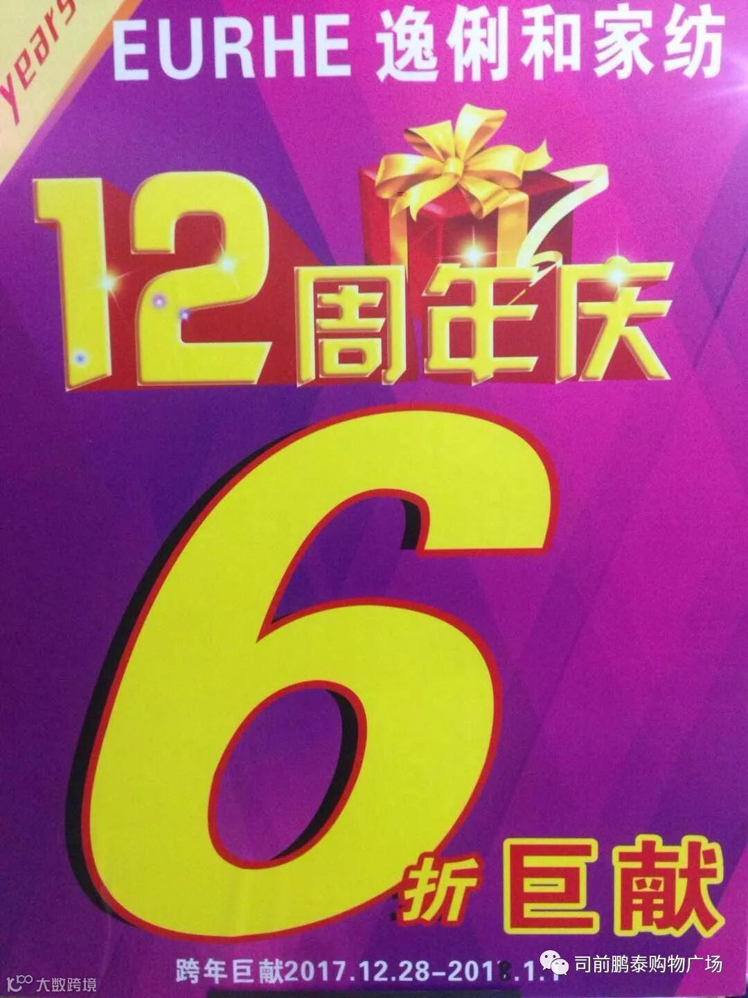 特大消息!!!鹏泰购物广场司前店(床上用品专柜)逸俐和家纺12周年庆!回馈顾客!豪礼相赠折扣超低,全场6折!抢到即赚到!!