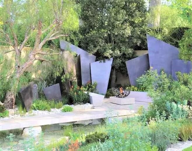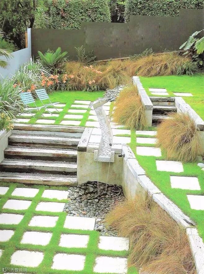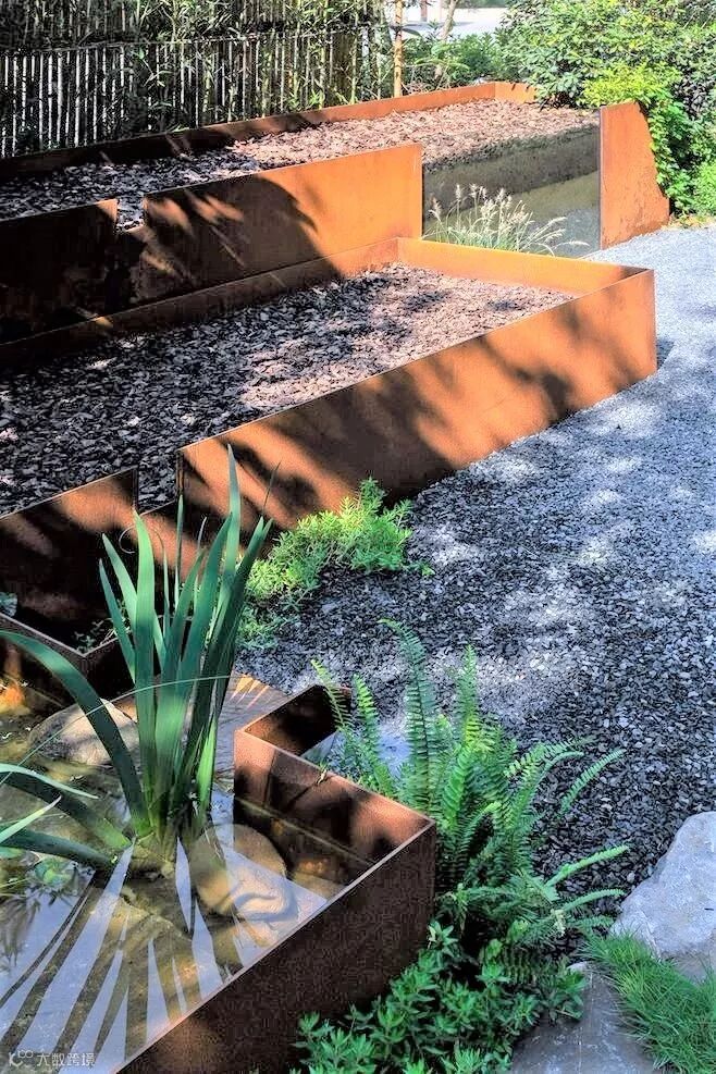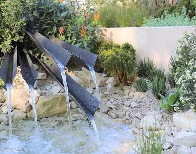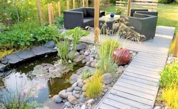 在造型上面流线形更加能让庭院与自然环境有机地融合在一起,但直线形则显得坚毅、简约。常见的形状有梨形、椭圆形、正方形,或者其他不规则的形状,并且有一定的坡度,这样才能保证尽可能多地收集雨水。