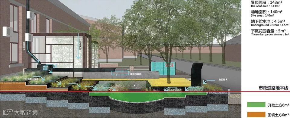 屋顶雨水经落水管进入弃流池初步沉淀后,一部分进入循环水景,另一部分通过层层台地滞留、净化、下渗,径流部分获得最长线的行走距离,汇入中心下沉花园。同时道路雨水从开口道牙经过台地净化,干净的雨水也汇入下沉花园。