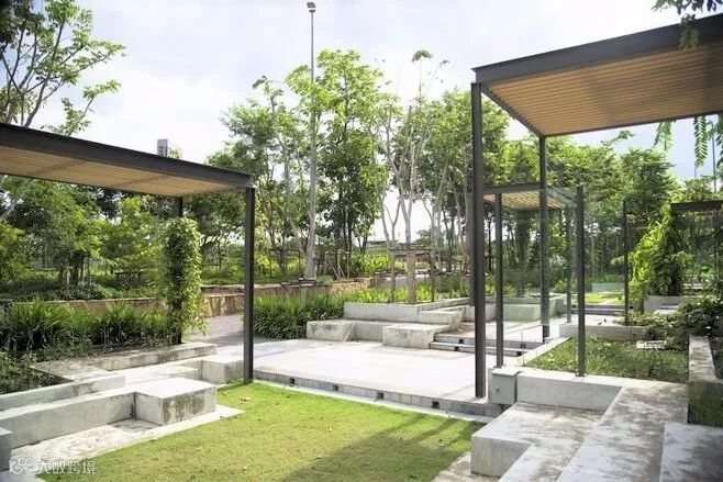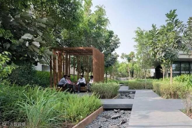 雨水花园对建筑屋顶及周边场地的雨水进行有效地渗透、滞留、净化、蓄积、利用、排放,对雨水进行管理,成为真正的雨水银行。阿普雨水花园新景观的微创新,雨水路径、台地、低维护植物、节能型材料和明快的色彩是其5个显著的特征。