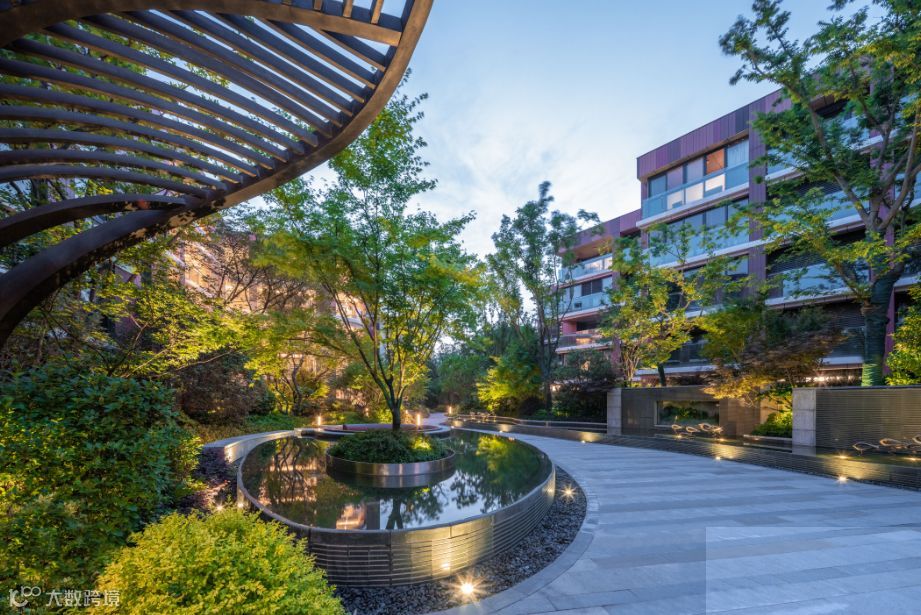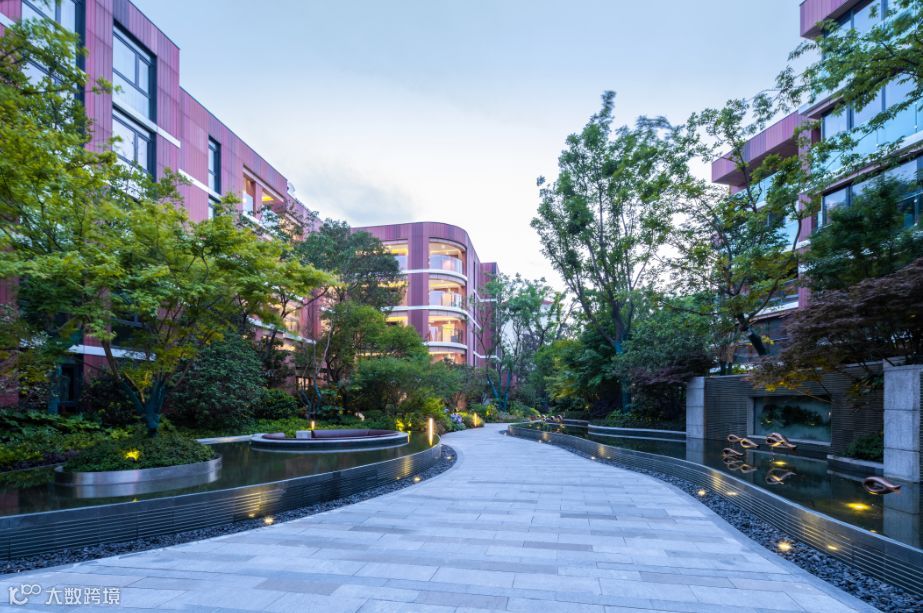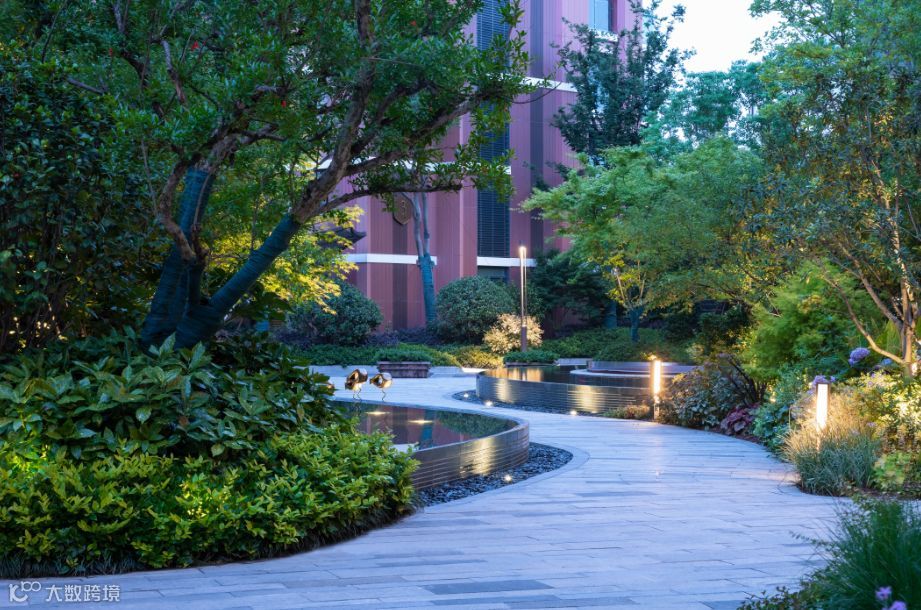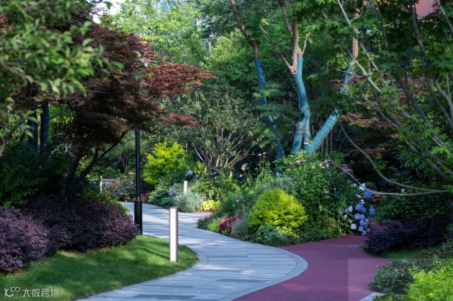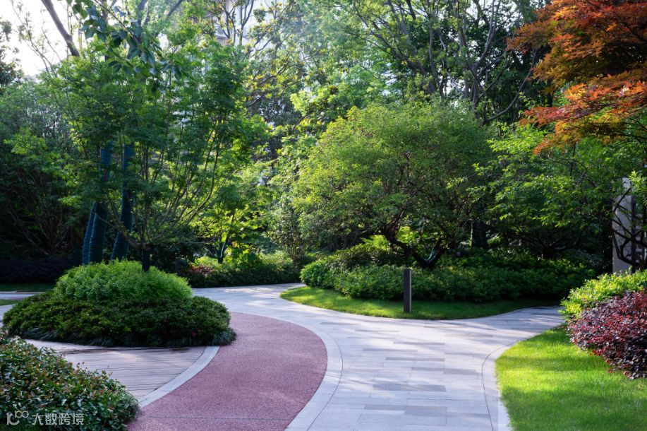植物的韵律散落在园区大小处,设计师采用多种植物、树种错落搭配,随着不同季节,形成四季不同景致。除此之外,设计师最大化发挥了植物的环保作用——种植净化能力强的植物吸收有害气体;利用冠大而浓密的植物达到滞尘效果;隔离降噪,丰富立体植被形成小区多层次的空间隔离,进一步达到静音降噪的效果。