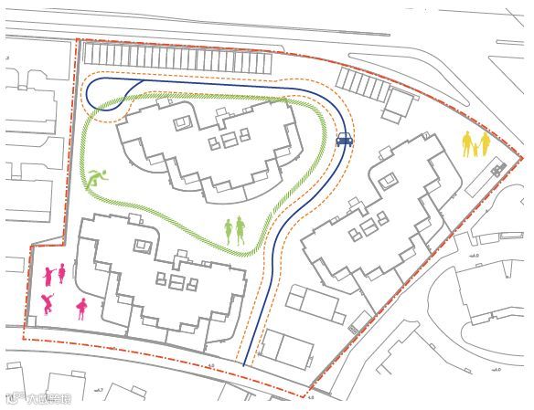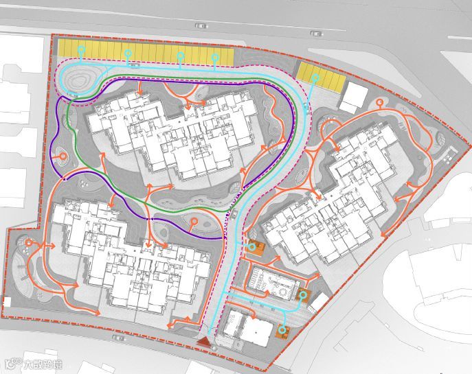 园区内部,设计师以道路为隔,形成不同的景观节点,并将人车动线明显区分,使其互不干扰。设计师通过铺地材质将车行道与人行道分开,车道避开中心景观区和活动场地,回家、慢跑的动线尽量与机动车流线不穿越,同时调整消防车道,使其与车行道结合,减少了隐形消防车道的设置,令消防登高面与停车场结合。