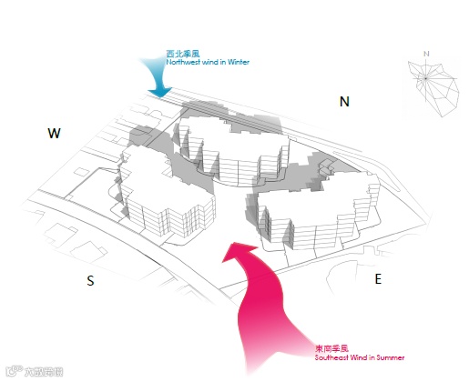 设计师依据场地日照分析,决定在园区内设置景观屏障,阻挡西北季风给小区带来的影响,将劣势转变为优势。同时,考虑到场地条件,设计师将机动车通道及停车设置在建筑北侧的阴影区域,人行及活动区域则布局于南侧阳光较好的区域,保证人行流线的光照度。