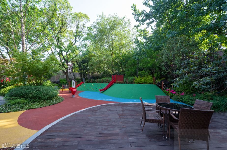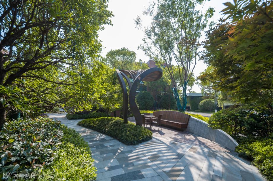 依照因地适宜的原则,设计师最大化地保留原有生长状况良好的乔木,并在边缘区域利用多层次植物设计遮挡旧围墙,丰富景观效果。在茂密的植株下方,设计师设置了雅致的休憩平台,使得户外行走的居者在炎热的夏天也可寻得一丝清凉。