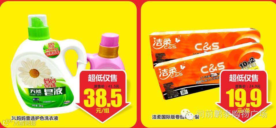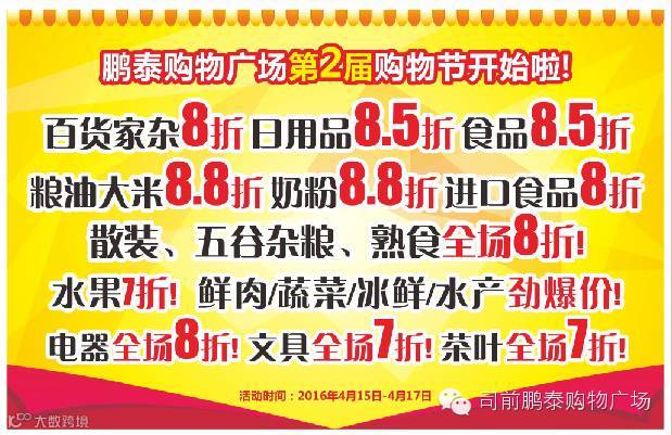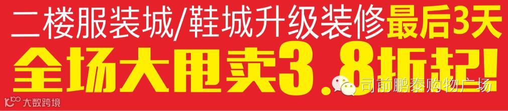 司前鹏泰购物广场鹏泰第2届购物节开始啦!!!百货家杂区、8折、食品、日用品区8.5折、粮油大米、奶粉8.8折、进口食品8折、散装、五谷杂粮、熟食全场8折!水果7折大酬宾,鲜肉、蔬菜、冰鲜、水产惊爆价!电器全场8折!文具全场7折!茶叶专柜全场7折!!(注:特价商品不参与折扣活动) 二楼服装城鞋城升级装修全场亏本清仓大甩卖,最后3天,机会不容错过哦!!!