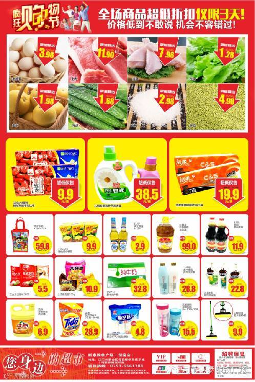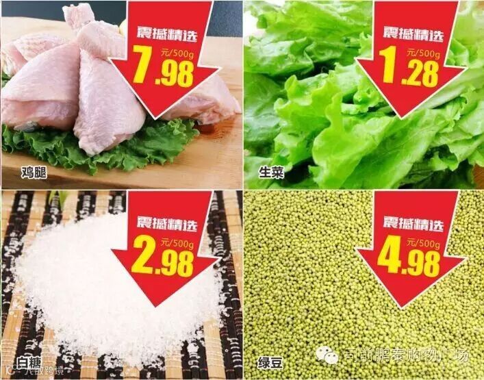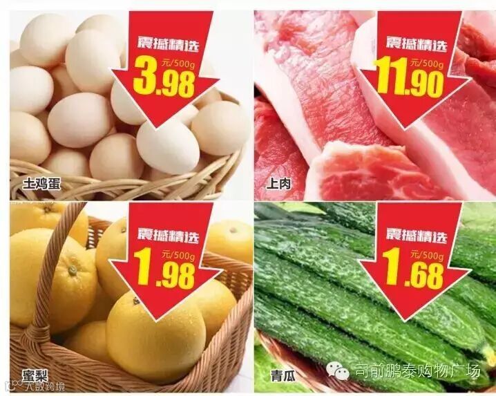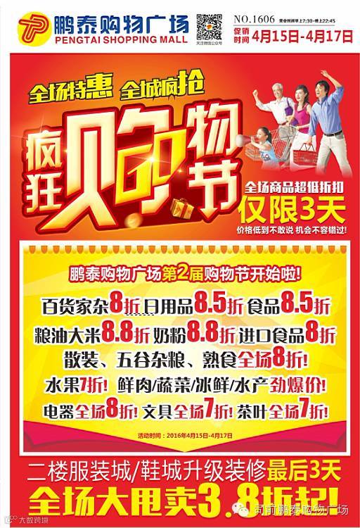 鹏泰第2届购物节开始啦!!!百货家杂区、8折、食品、日用品区8.5折、粮油大米、奶粉8.8折、进口食品8折、散装、五谷杂粮、熟食全场8折!水果7折大酬宾,鲜肉、蔬菜、冰鲜、水产惊爆价!电器全场8折!文具全场7折!茶叶专柜全场7折!!(注:特价商品不参与折扣活动) 二楼服装城鞋城升级装修全场亏本清仓大甩卖,最后3天,机会不容错过哦!!!