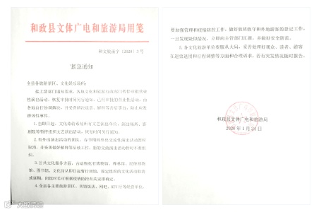 为防控新型冠状病毒感染的肺炎疫情扩散,避免人员聚集引发交叉感染,根据2020年1月24日“关于和政县文体广电和旅游局发出的紧急通知”,全县各主要旅游景区、宾馆饭店,要加强管理和疫情防控工作,为了广大游客朋友的健康与安全,甘肃云发酒店管理有限责任公司(云海闲庭度假酒店)决定于2020年1月26日起暂停营业,恢复开放时间另行通知,敬请广大游客理解与配合!