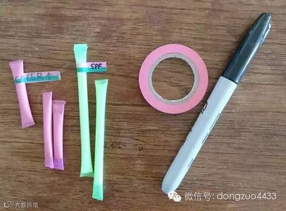 巧用吸管,让所有的乳液、护肤品、洗面奶量化到吸管里。最后不要忘记用彩色贴纸标注清楚里面装的是什么。