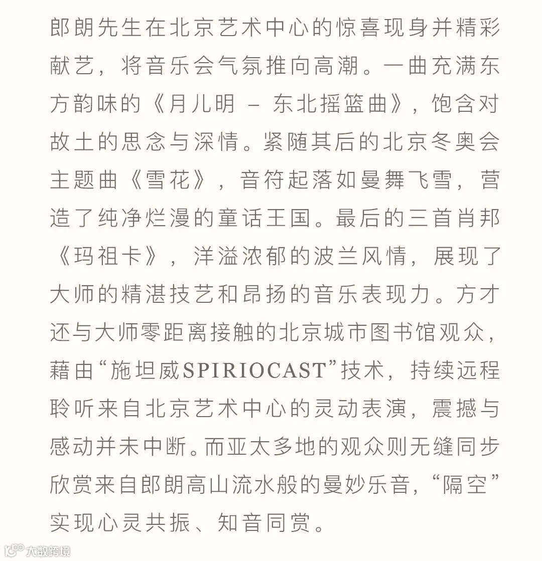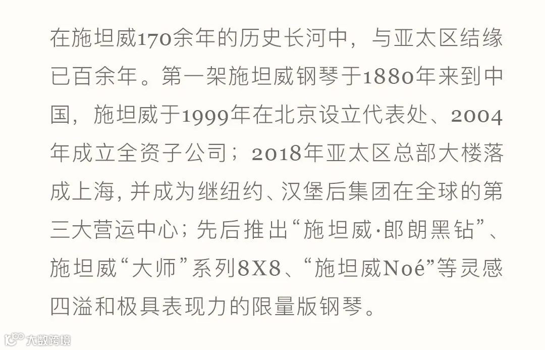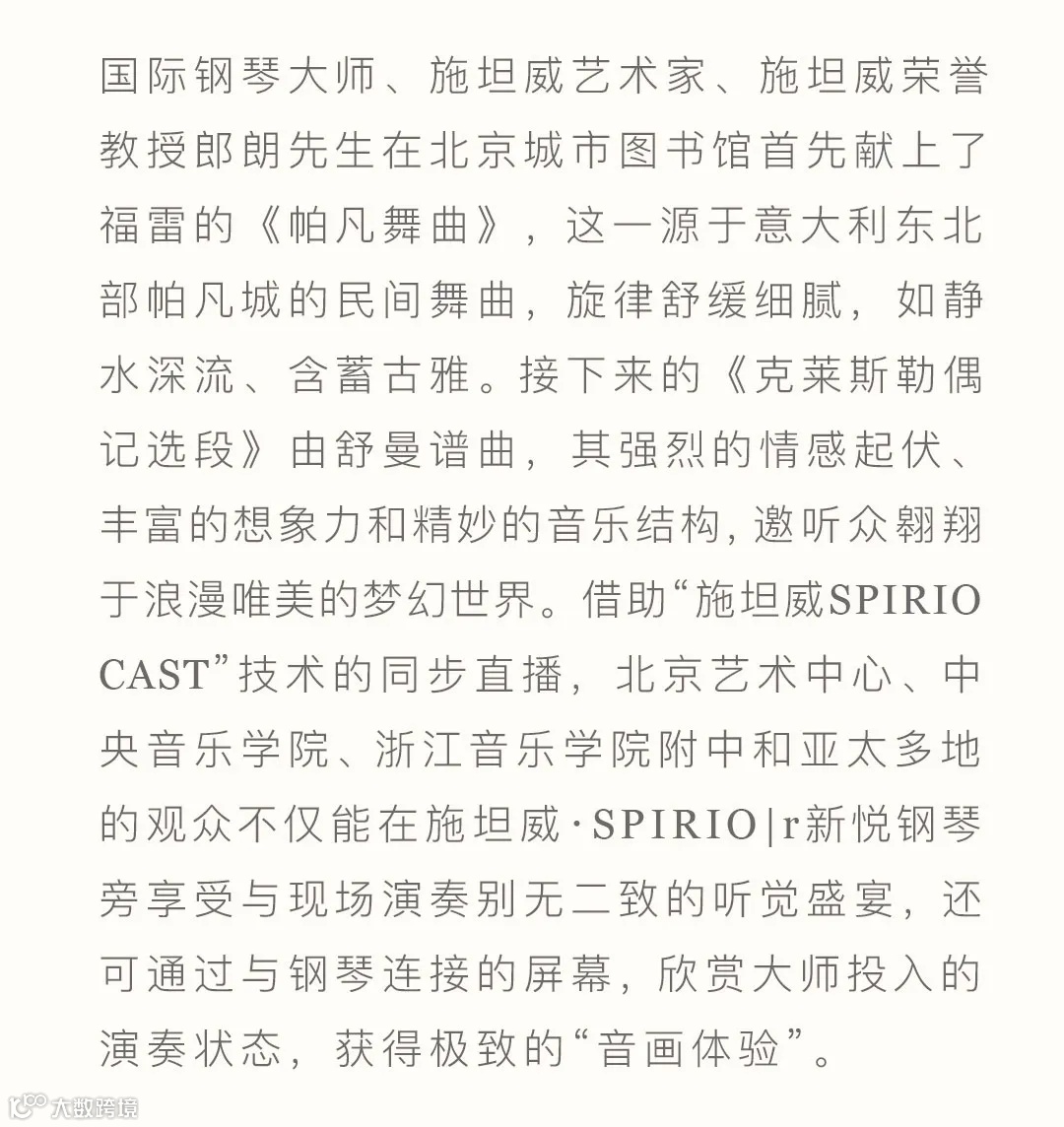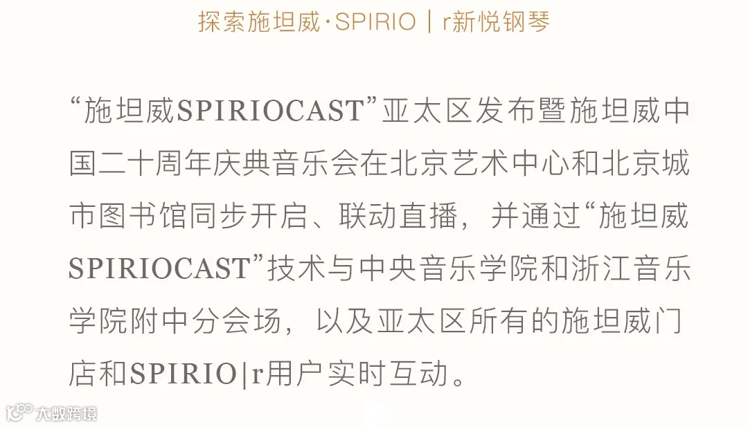 导读:百年传承施坦威筑梦中国二十载#施坦威艺术家 郎朗领衔#施坦威SPIRIOCAST 亚太区发布暨施坦威中国二十周年庆典音乐会新的起点 新的征程#施坦威钢琴 将持续书写传承经典与恒久创新的华彩乐章
