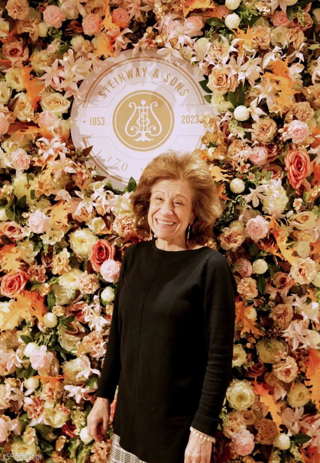 教授到店后在施坦威艺术家墙上签名留念,并在施坦威成立170周年纪念花墙前留影。