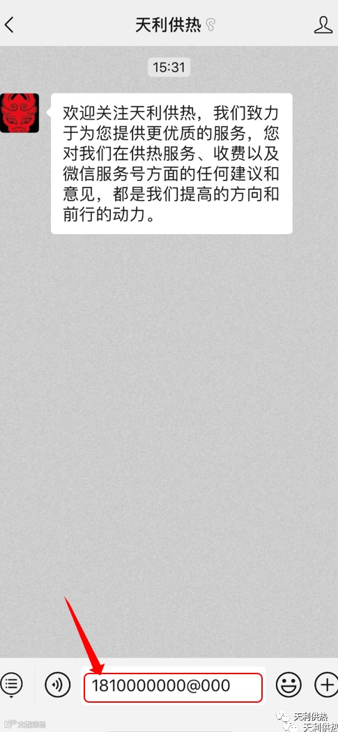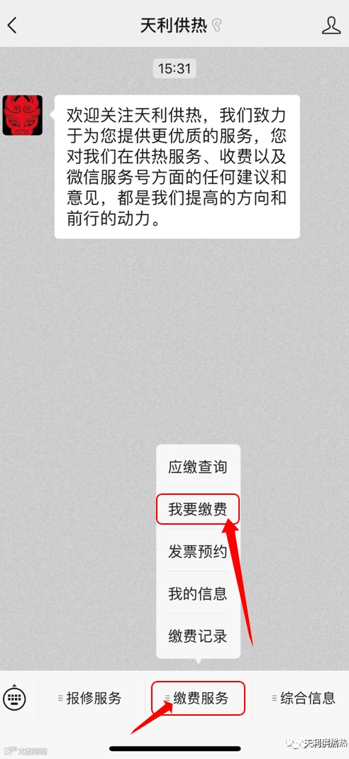 关注公众号后,编辑您住房的10位用户编码@3位验证码(您可联系您所属区域的收费处:A区收费处80487162;B区收费大厅80465970;北七家翡翠公园收费处18519213569获取用户编码)发送到公众号(如图),进行绑定,等您收到“绑定成功!”回复后,点击“缴费服务”中“我要缴费”(如图)核对您家的户址和金额就可以进行缴费了。