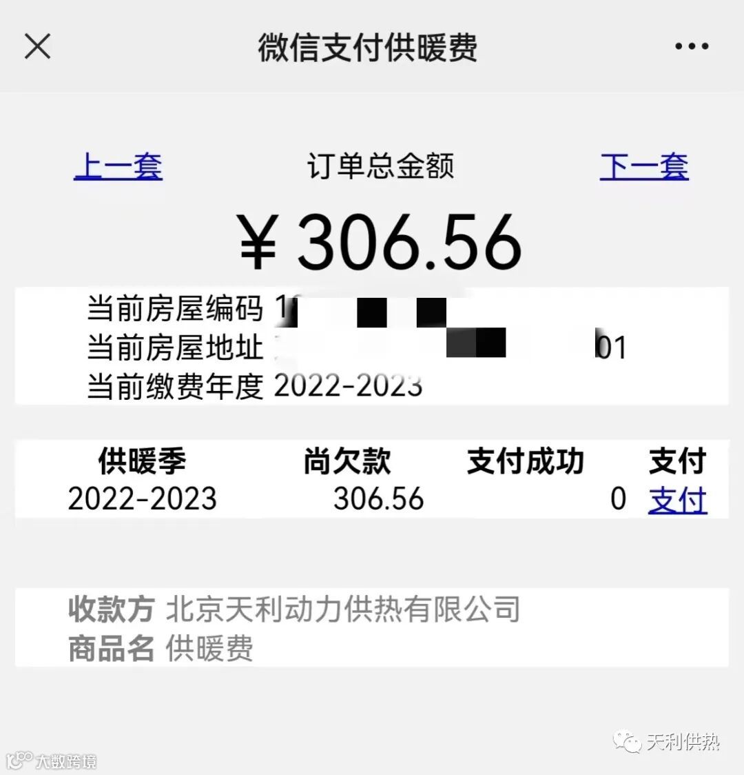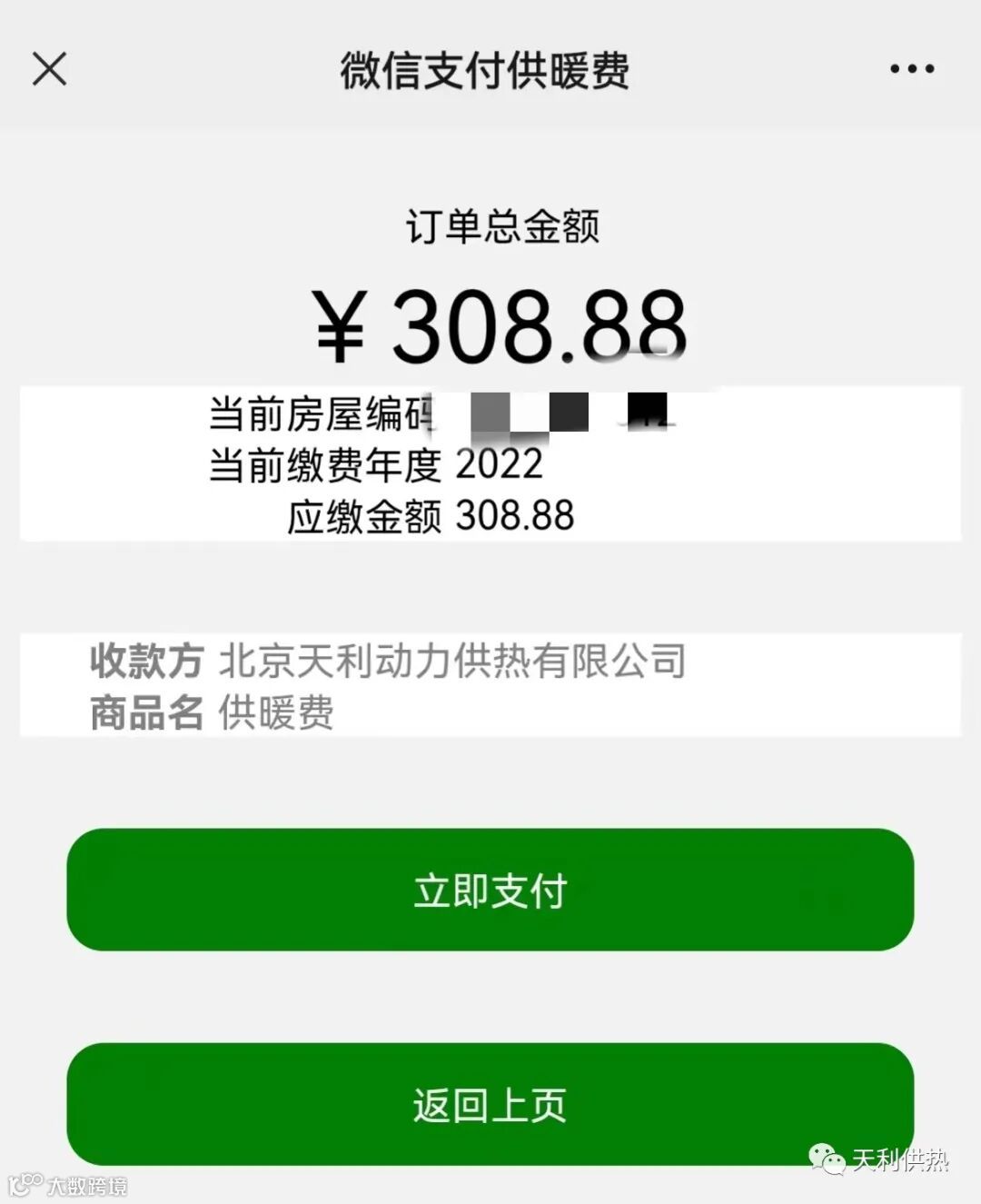 核对您的房屋编码、房屋地址、缴费年度和缴费金额,确认无误后,点击“支付”