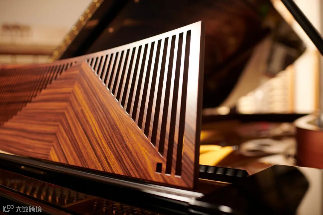 “施坦威—上海交响”限量版钢琴的主体部分由珍贵的桑托斯红木制成,顶盖一侧是典雅内敛的黑色乌金桑托斯红木,背面一侧则另有乾坤。以上交“音乐点亮城市”的主视觉为设计灵感,桑托斯红木原有的深褐色木材呈现出光线照射时的渐变效果,从顶盖中心宝石般的深褐逐步过渡到周边的寂静黑色,营造了钢琴在舞台聚光灯下的高光时刻,同时寓意140年前,上交在历史聚光灯下诞生的那一刻。