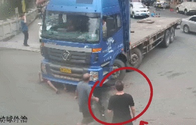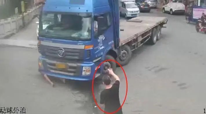 民警通过查看公共视频发现:原来大货车在放慢车速准备驶入右转车道时,这名男子推着自行车走进了大货车视觉盲区,眼看他连人带车被卷入车底,路边那位黑衣男子朝司机猛打手势叫停。
