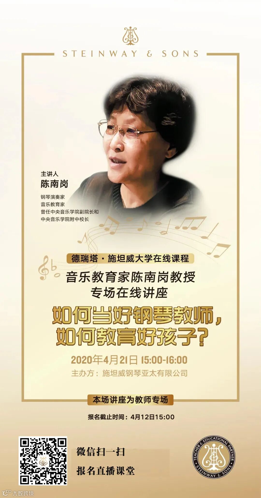 作为一位在音乐教育领域有着丰富教学指导经验的教师,陈南岗教授不仅热爱钢琴演奏教学,同时也致力于对钢琴教师的培养。她希望好的教师能将打开音乐艺术大门的钥匙交给学生,培养学生对音乐的兴趣,也能养成良好的演奏意识。本次讲座陈南岗教授将分享她多年作为钢琴教师的心得体会与心路历程,以及对学前音乐普及教育的一些想法。