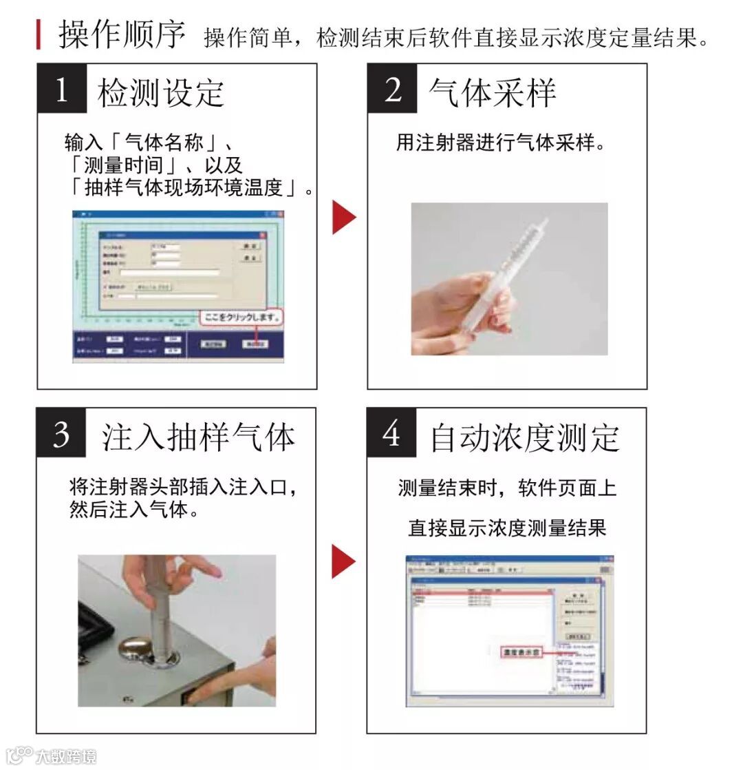 无需前置处理气体,直接注入抽样气体就能进行检测分析。一般的气体分析仪器(如GC/MS、GC/FID等)在分析小于1ppm的VOC气体时,需要在分析前进行气体处理(浓缩处理)。便携式气体分析仪XG-100系列采用COSMOS独有的超高灵敏金属氧化物半导体式传感器,无需进行抽样气体前处理。用注射器抽取气体后可直接注入设备进行检测分析。