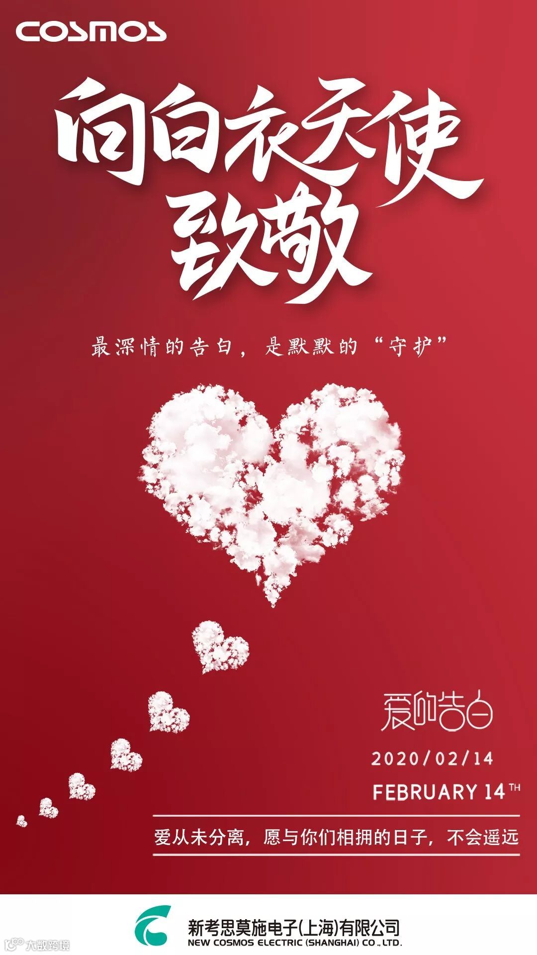 在这个特别的情人节,COSMOS向所有在抗击疫情最前线的工作人员献上诚挚的祝福,正是您们的逆行转身,义无反顾地奋战,用您们的坚定意志为我们构筑了安全的防线。