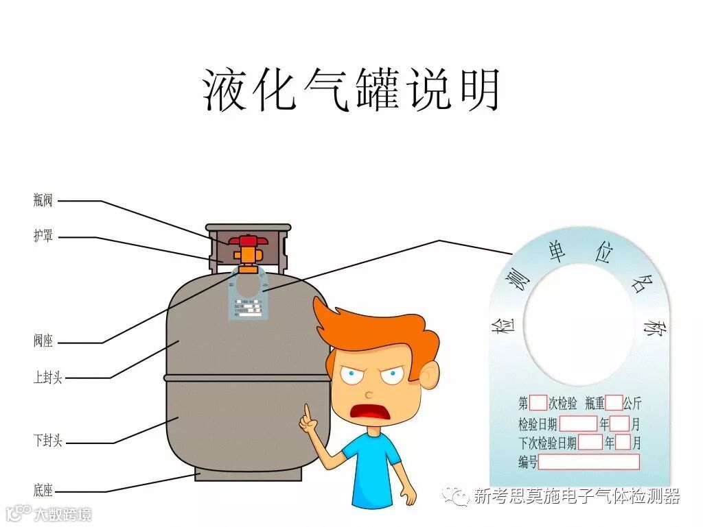 6、气瓶是一种特殊容器,一般使用寿命为8年,中途(4年)检测一次。液化石油气的爆炸范围虽然不太宽,但因其下限小,所以,一旦泄漏容易引火爆炸;