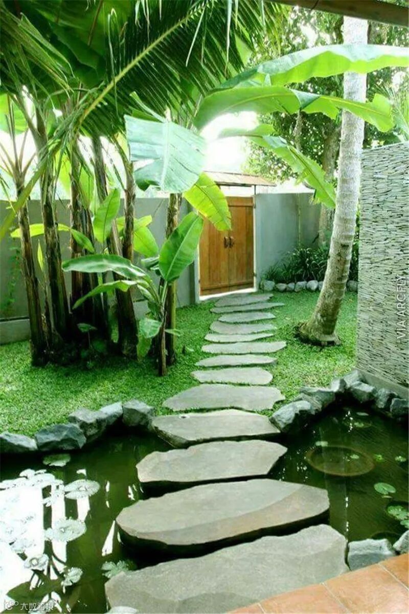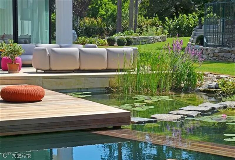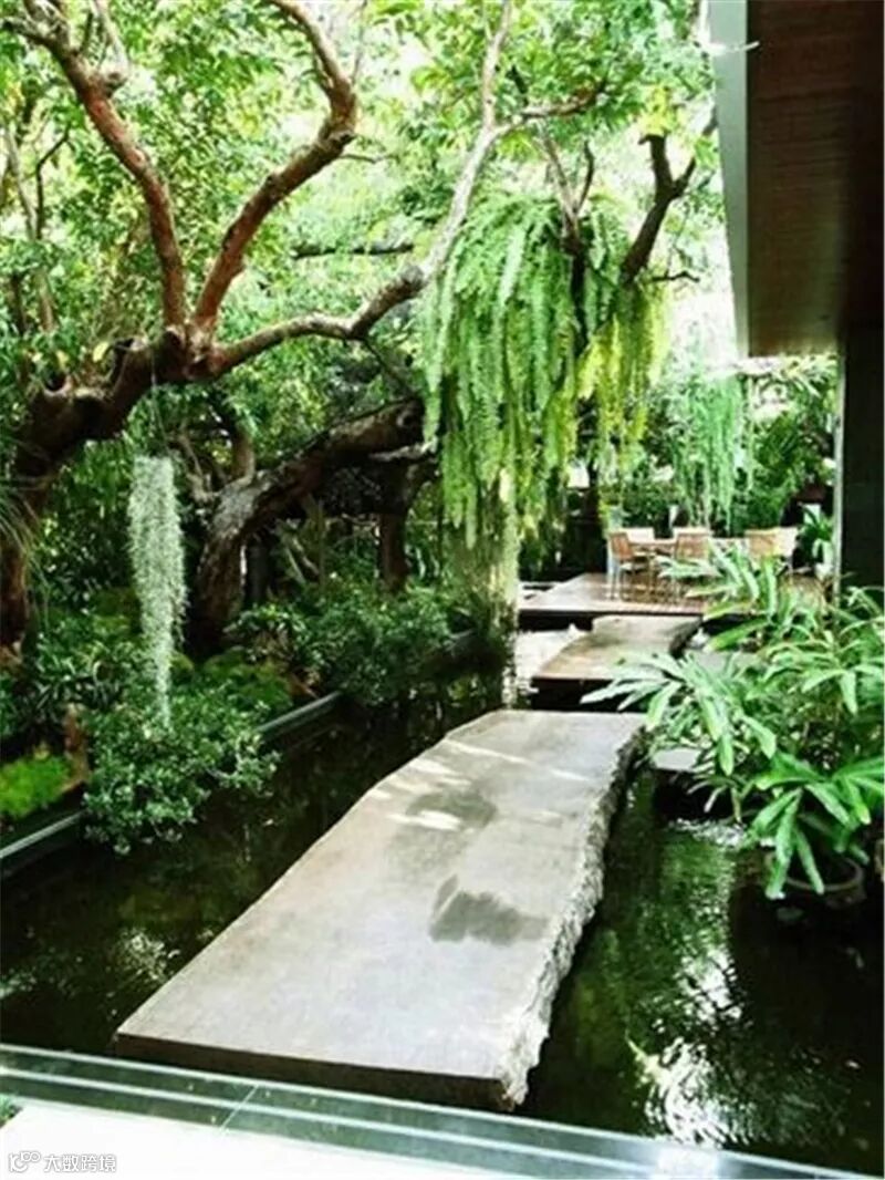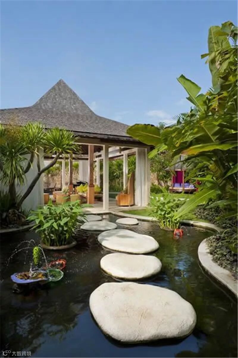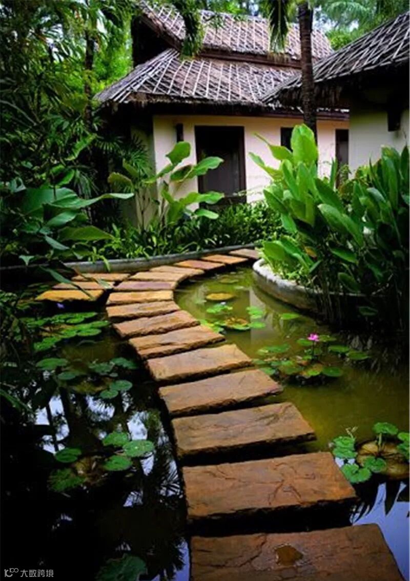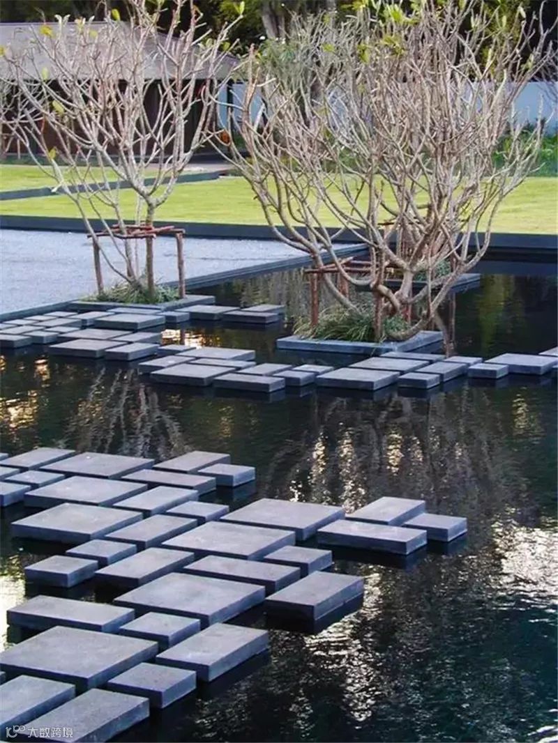 庭院中不管是泳池还是浅水景,一两块汀步涉水其中,家人三两步踏足其上,带着不一样的情趣感受。