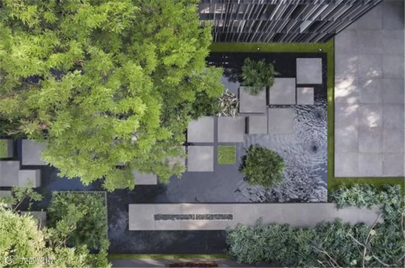 规则的汀步以不规则的排列,在水中呈现出不同的效果。