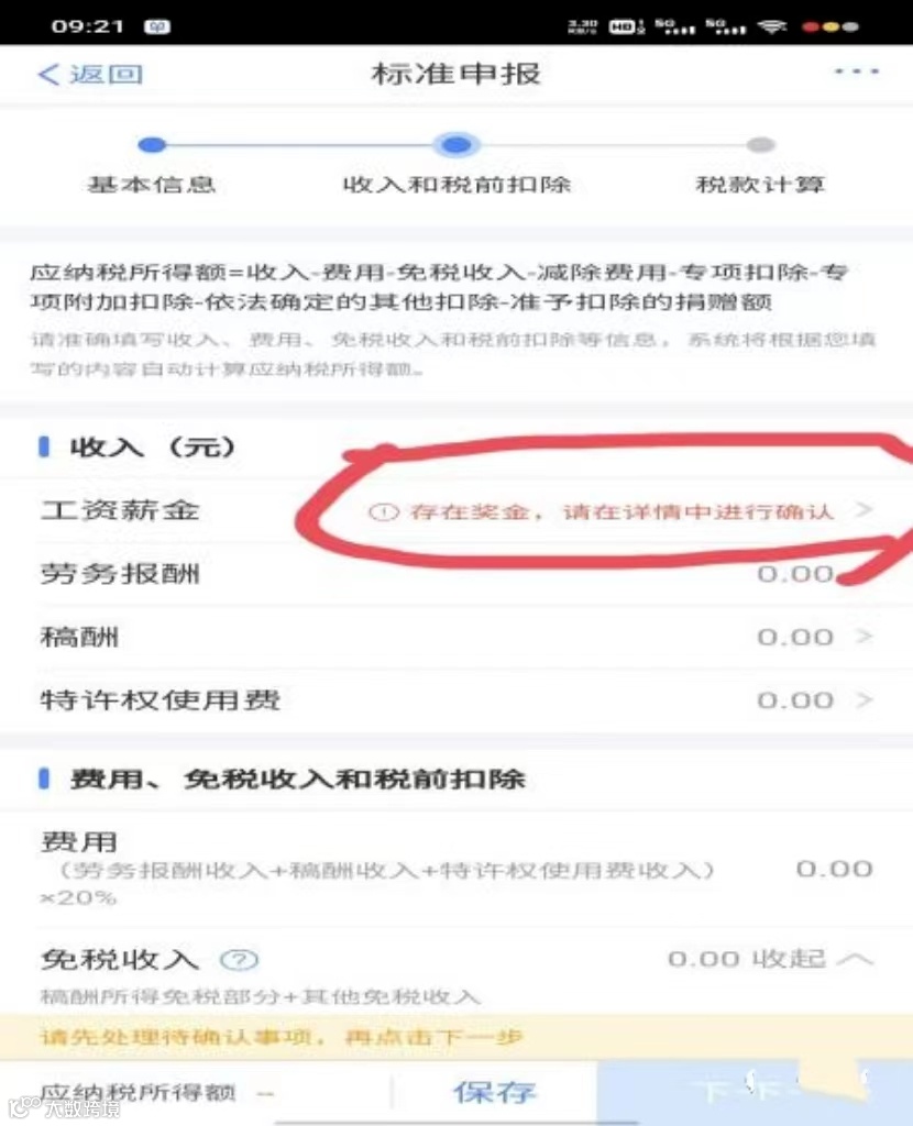情况三:如收入下,工资薪金处显示“存在奖金,请在详情中进行确认”字样,点击此行,通过【奖金计税方式选择】进行设置。此处默认在“单独计税”位置打勾,两种计税方式分别选择后进入到下一步界面,查看最终出现的应补或应退税额数值(注意先不要提交哦,这里只是先查看数据),对比两种方式下出现的数值,看看哪种方式对自己更合适,(应补税额小或应退税额大),就按哪种方式提交申报。