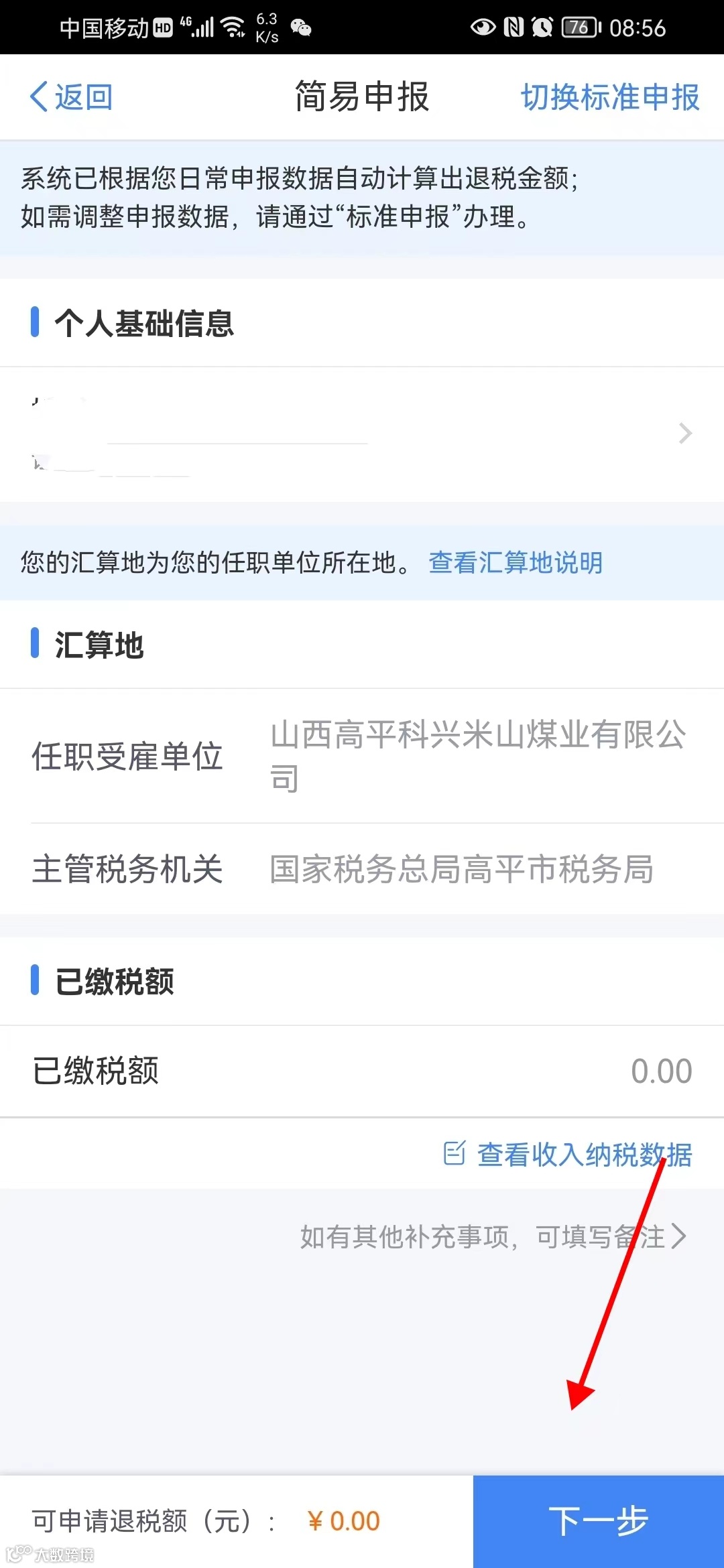 情况二:如需退税则先查看自己应退税额,点击提交申报,最后绑定银行卡进行退税;
