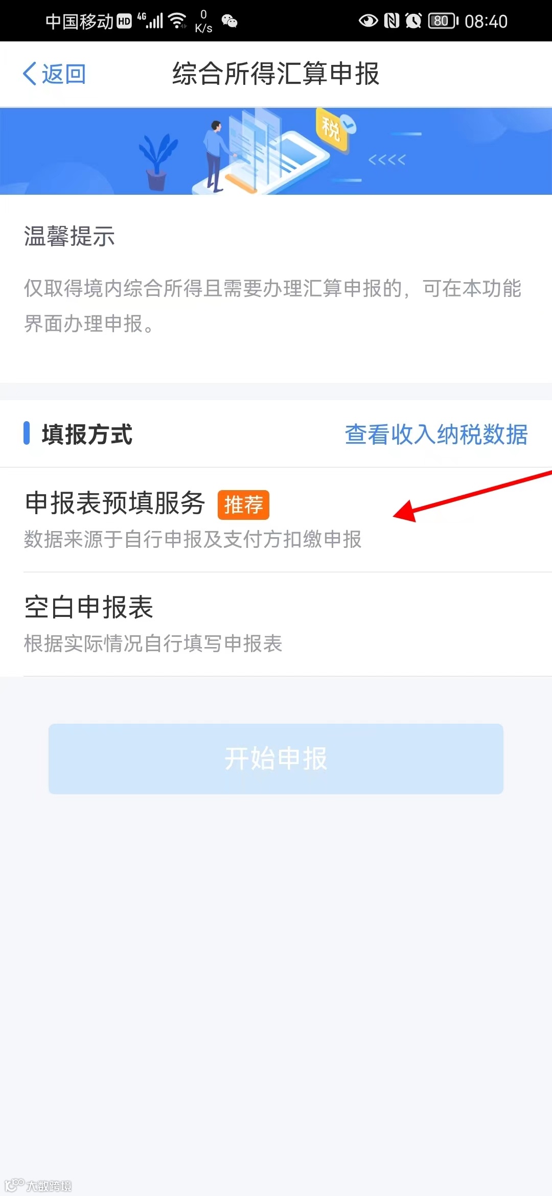 3、点击【综合所得年度汇算】,选择申报年度后,进入综合所得汇算申报页面,选择【申报表预填服务】点击【开始申报】,如下图所示: