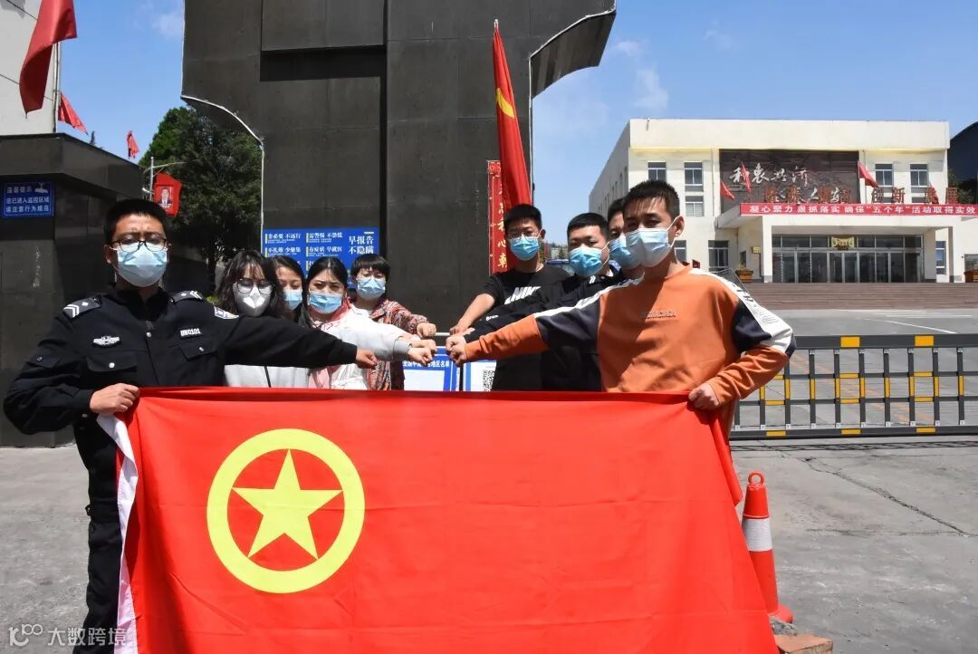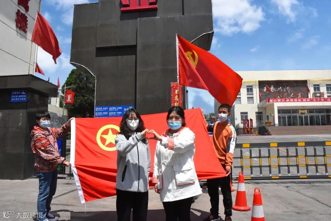 晒出与团旗合影