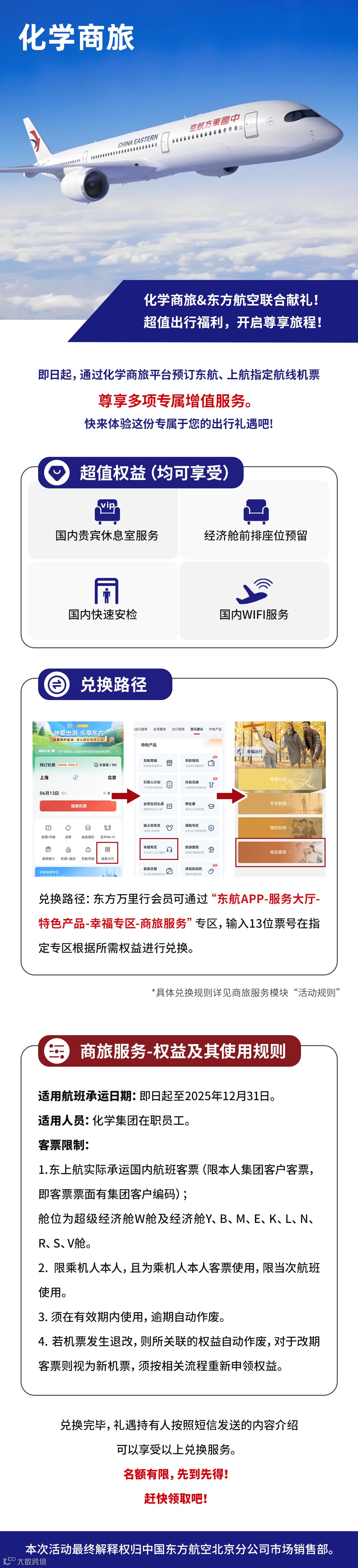 2、通过化学商旅平台预订东航、上航指定航班即可免费享受4项超值权益--国内贵宾休息室服务、经济舱前排座位预留、国内快速安检、国内WIFI服务。