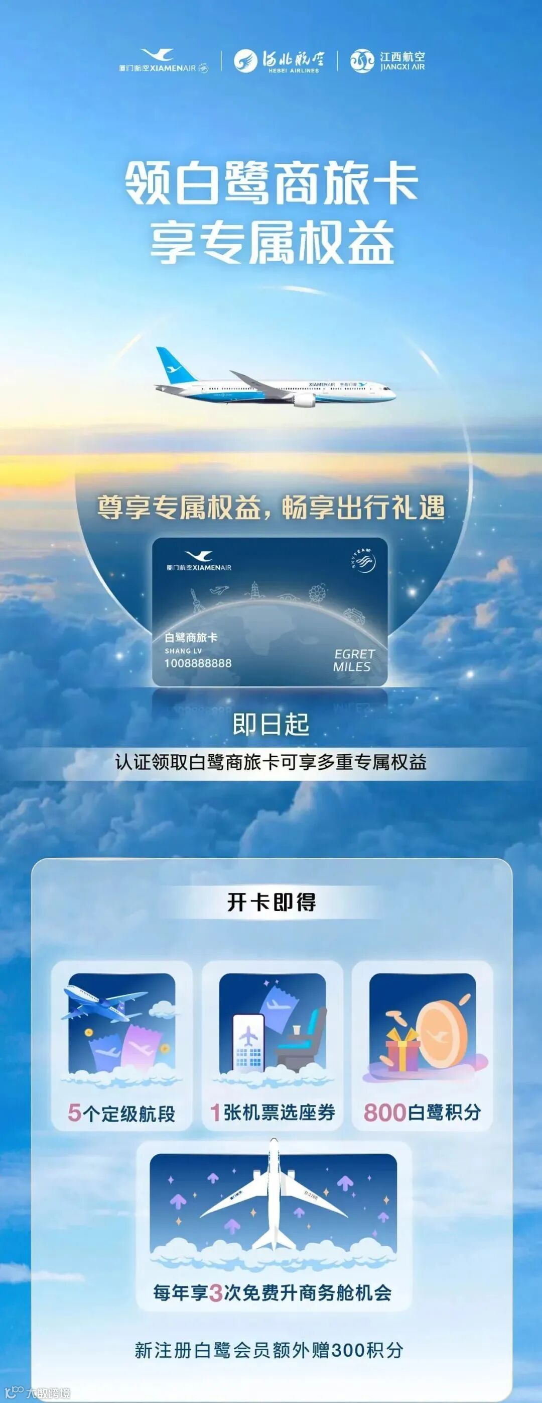 1、认证领卡即得5个定级航段、1张机票选座券、800白鹭积分、每年享3次免费升商务舱机会,新注册白鹭会员额外赠300积分;