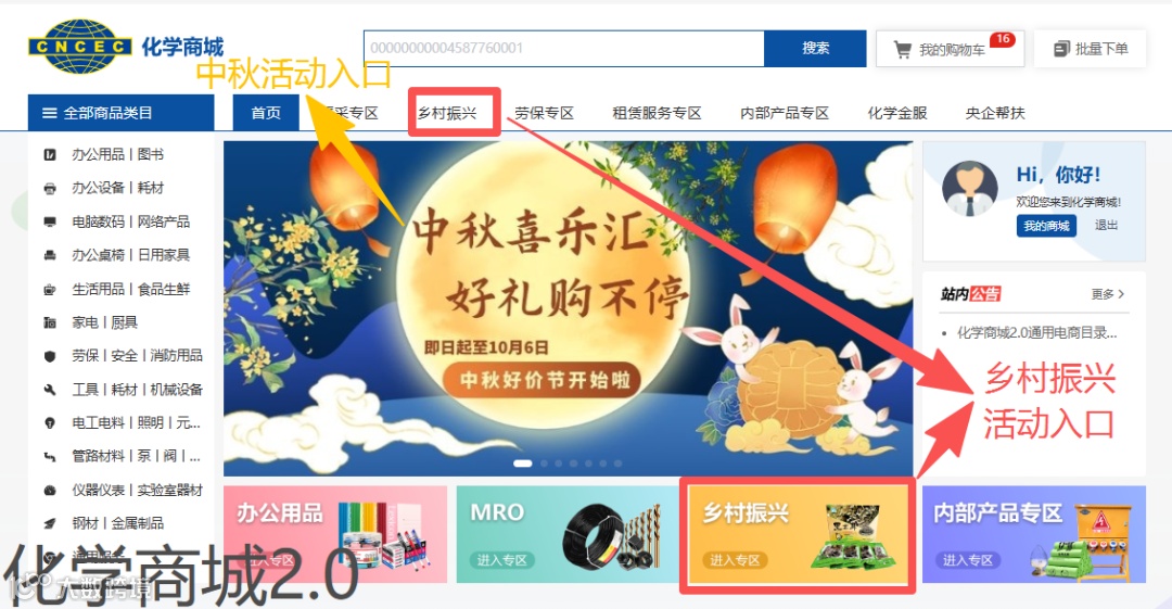 为满足企业中秋福利产品采购多样化的需求,化学商城联合电商、农产品合作伙伴搭建了【中秋喜乐汇】和【乡村振兴】活动专区,推出中秋特别福利产品,欢迎各企业放心采购!