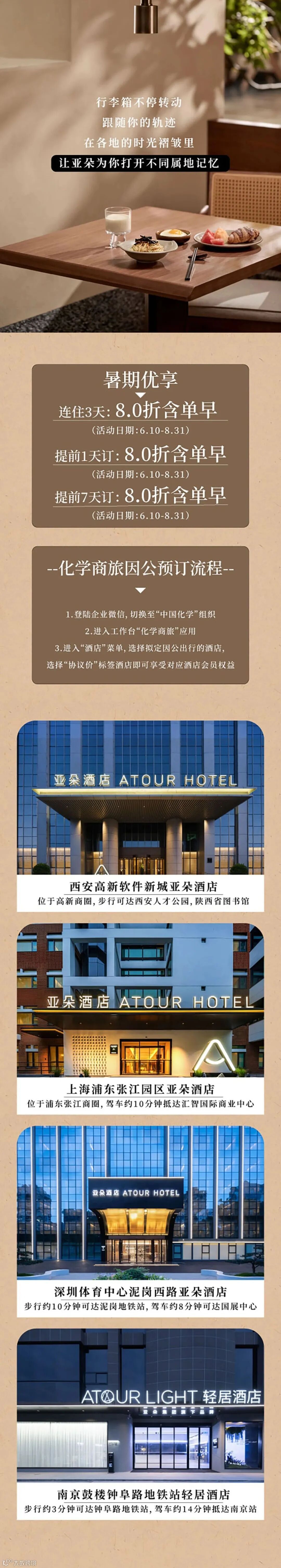 化学商旅平台已经引入协议酒店资源(亚朵、华住会、东呈、首旅如家、百达屋、锦江等酒店集团,渔阳饭店、北京乾元酒店、东方花园酒店、保利大厦酒店、北京百富怡大酒店等集团总部及二级企业周边单体酒店),企业协议折扣整体优于个人铂金会员,且较其它第三方平台有显著价格优势,同享免押金、双早、限时免费取消、延迟退房至15:00、免费升级房型、免费停车场、自助洗衣房、健身房等服务。通过化学商旅平台预订酒店可享免垫资、个人免开票、免押金、差旅报销一键引用、7×24小时服务保障及协议酒店福利等。