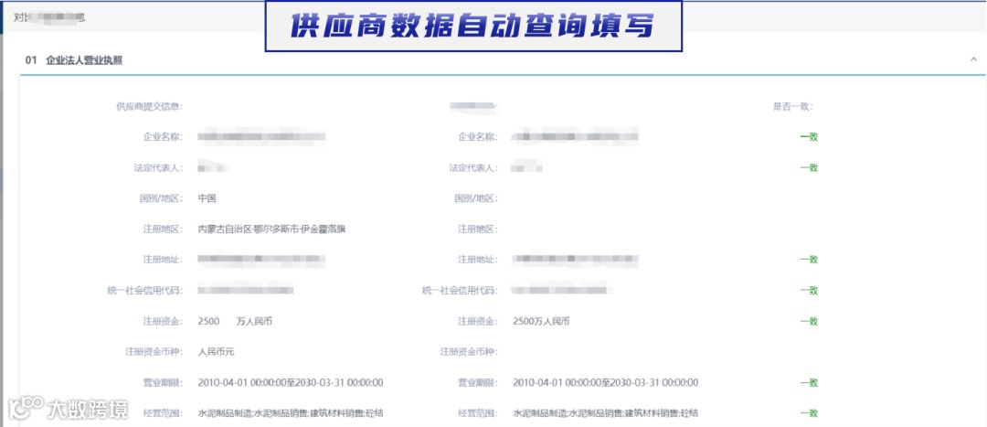 供应商数据自动查询填写功能,依托第三方大数据平台,实现用户注册信息自动反填,平台自动校验,使得供应商注册、审批时间缩短了一半以上。
