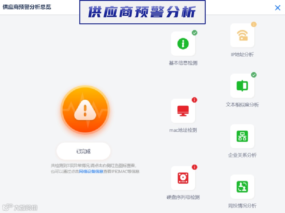 供应商预警分析功能,依托第三方大数据平台,自动识别供应商之间的关联关系,并对IP地址、文本相似度等信息进行分析,有效协助招标人及时发现、规避潜在风险。