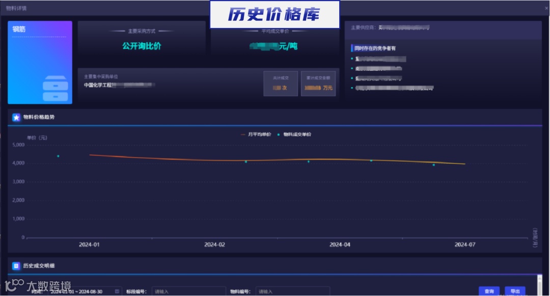 历史价格库,展示物料价格趋势及历史成交明细,为采购人提供决策支持。