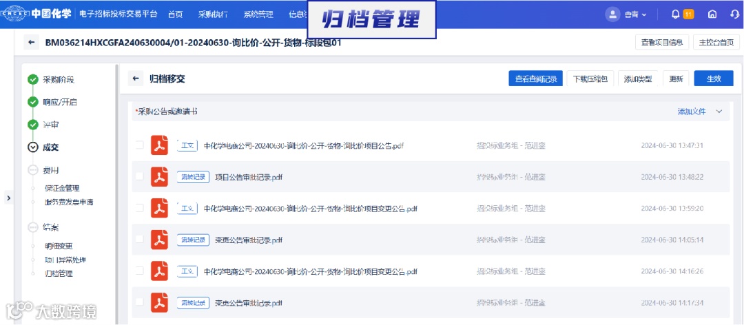 归档管理功能,汇集采购各个阶段的文件及报告,以便于后续的监督管理。