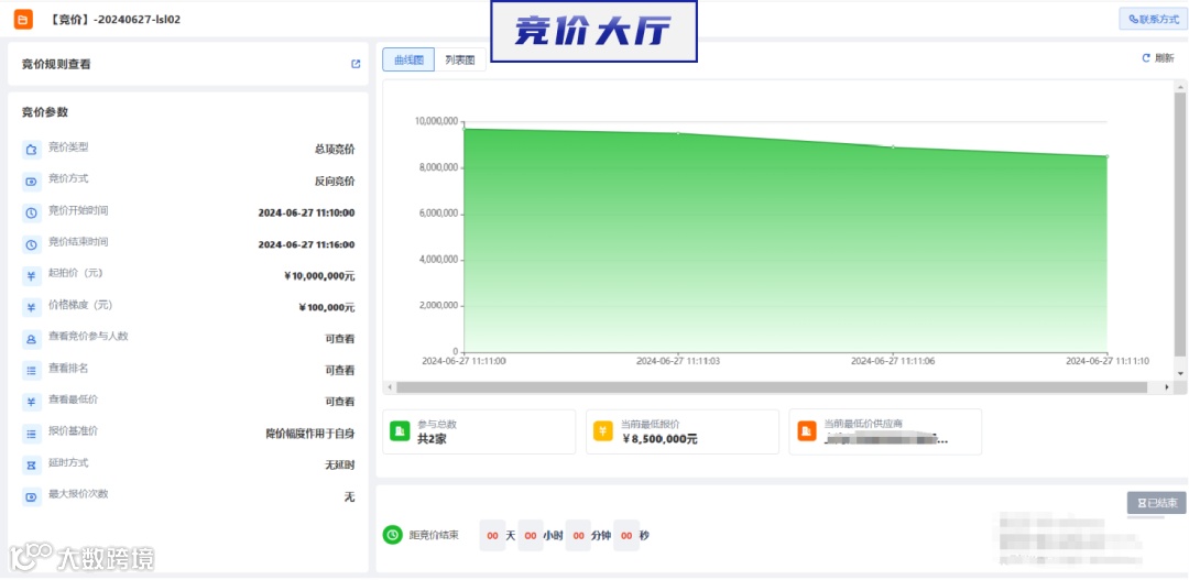 竞价大厅,实时展示各项竞价参数及供应商报价信息。
