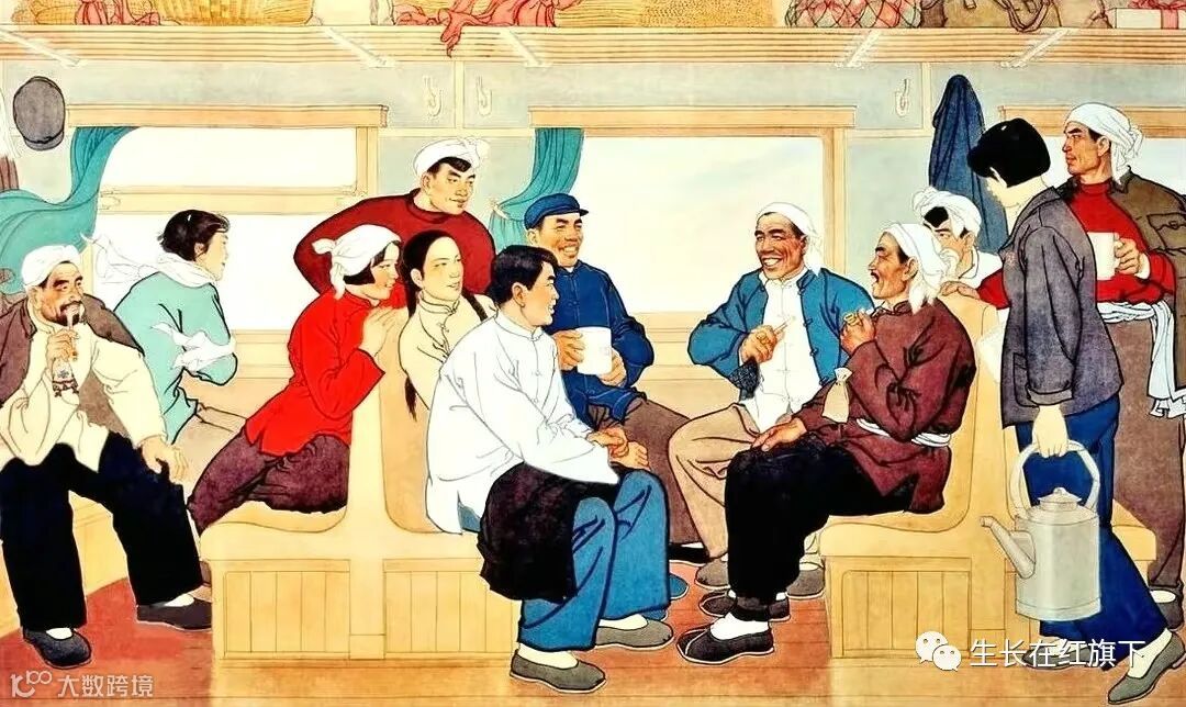 10、1964年出版的《群英赴会》年画,作者是姚天沐、张怀庆、李玉滋,在一辆列车的车厢中,来自各地的英模代表,欢聚一起,交流着农业战线上的经验和心得。