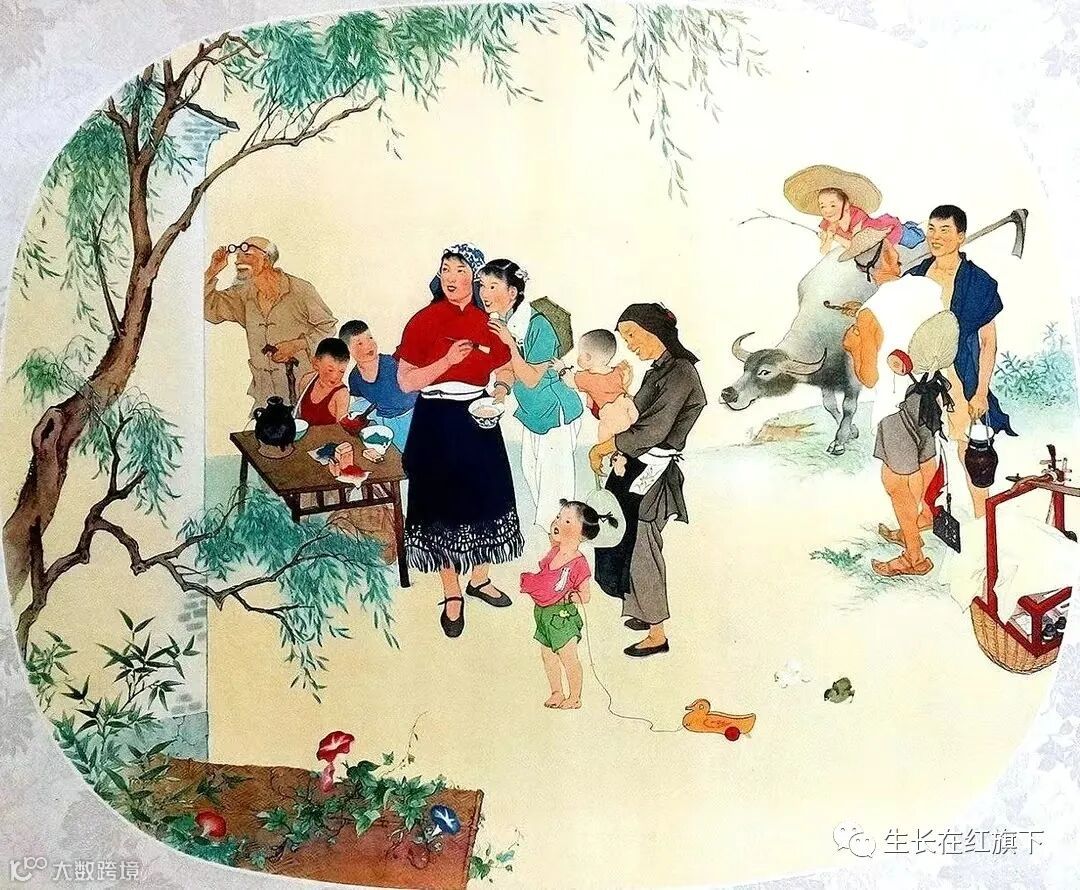 2、1961年出版的《喜绘图》年画,作者是顾生岳,在村口的一户人家前,一位女子手里拿着画笔和颜料,正看着墙上自己的作品,旁边的老人和小孩看得格外认真,后面的放牛娃和干活归来的社员,也伸头观望。