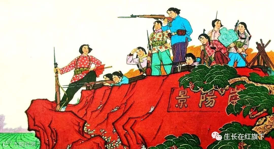 6、1966年出版的《景阳冈上十姐妹》年画,作者是郝丕瑜、王辉亮,一群年轻的女民兵,来到了景阳冈上,曾经的武松打虎地,成为了巾帼女子的训练场。