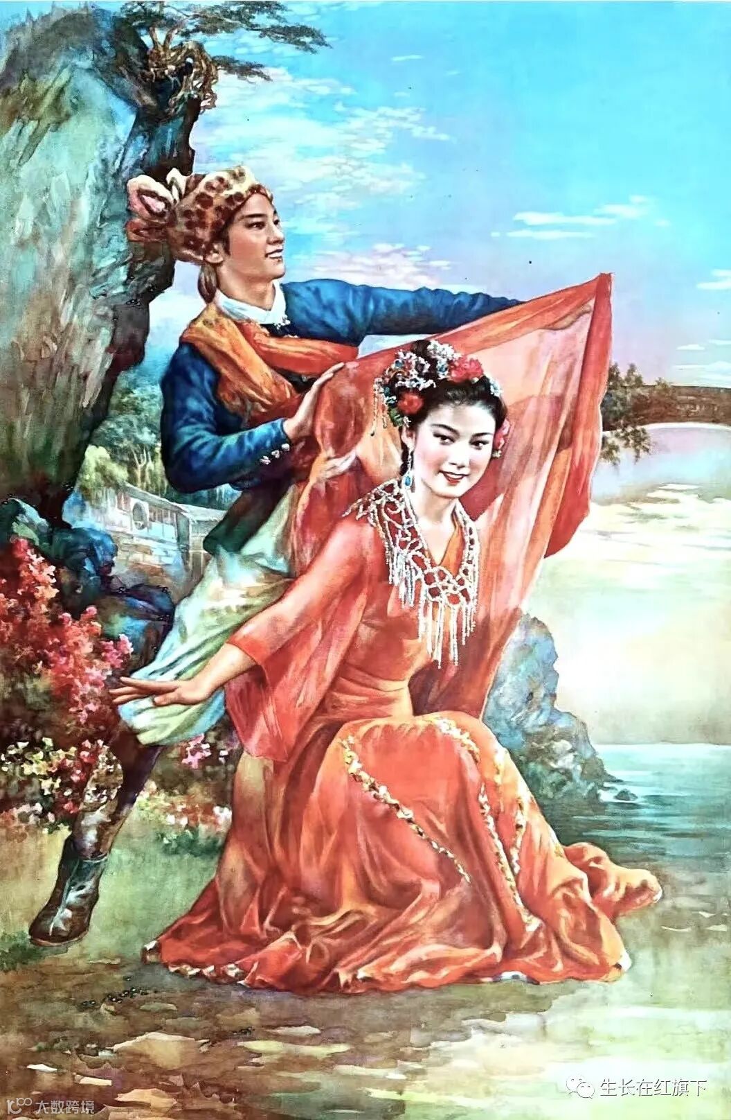 5、1962年出版的《鱼美人》年画,作者是金雪尘,源自古代神话传说中,一位美丽的大海公主鱼美人,遇到了年轻英俊的猎户青年,两人之间经历了一场磨难之后终成眷属。