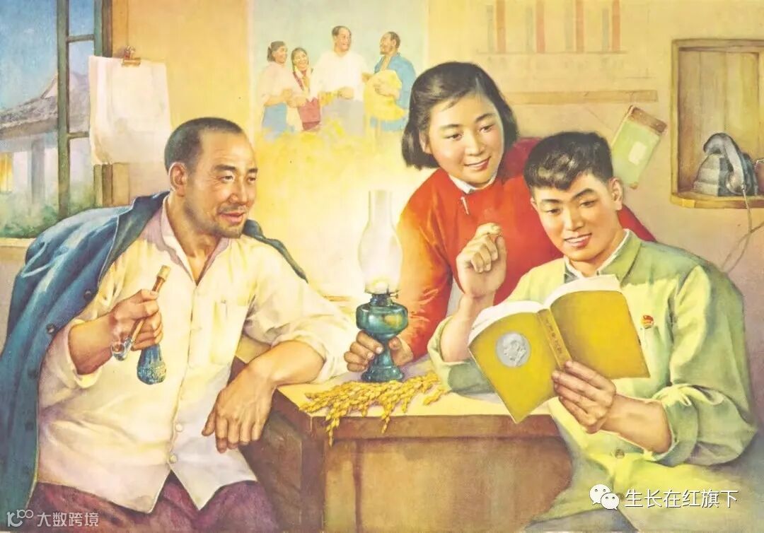 1、1964年出版的《读书听话》年画,作者是庞卡,在一个队部里,窗外月色如银,屋内灯光亮堂,老队长一手攥着旱烟袋,一边认真听着年轻人诵读伟人选集,旁边的女子移动着煤油灯,后壁的墙上贴着伟人深入农村的画作。