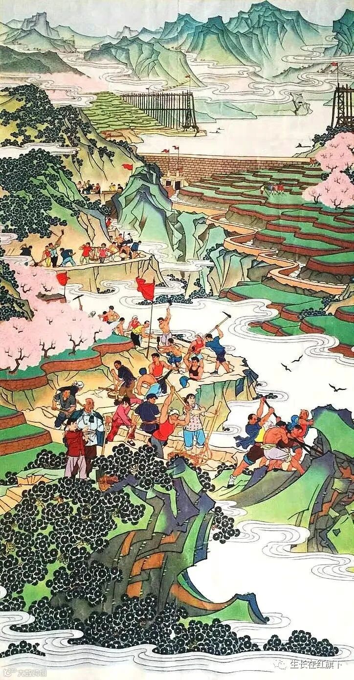 8、1965年出版的《开山引水干劲高、改变山区旧面貌》年画,作者是施邦华,在莽莽的群山中,为了将水引到缺少的山区,来灌溉开垦出的山坡梯田,社员们鼓足干劲,发扬愚公移山的精神,开山挖渠来引水。