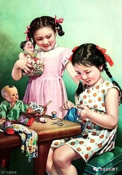 3、1962年出版的《给娃娃做新衣》年画,作者是谢慕连,桌子旁有两个小姐妹,左边穿着粉红裙子的小女孩,手里捧着一个娃娃,她正看着坐在凳子上小女孩缝制给娃娃穿的衣服,不知如今六十多岁的女性读者朋友能否记得儿时的这一刻。