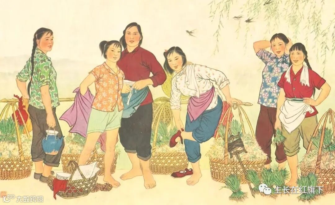 4、1964年出版的《春到田头插秧忙》年画,作者是宋忠元,春天到了,杨柳依依,燕子飞来,一群女社员,风风火火,挑着秧苗,送入田间,准备马上插秧,干劲十足意气风发。