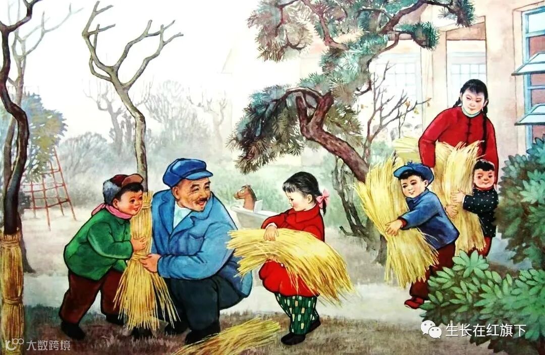7、1965年出版的《保护树木过冬》年挂画,作者是张岳健,在一所小学校的校园里,一位大爷正在给树木包着稻草,在老师的带领下,几个稚嫩的孩子们,纷纷抱来稻草,积极参与爱护树木的行动中。