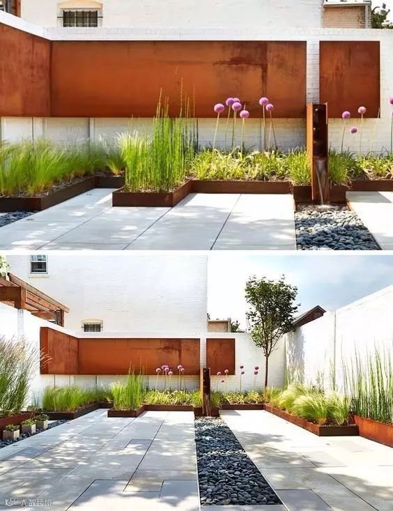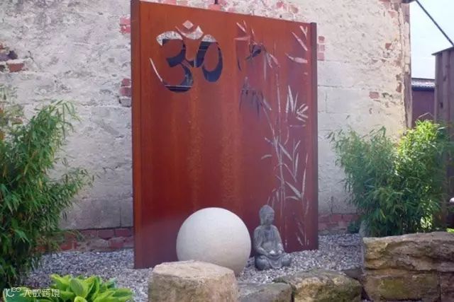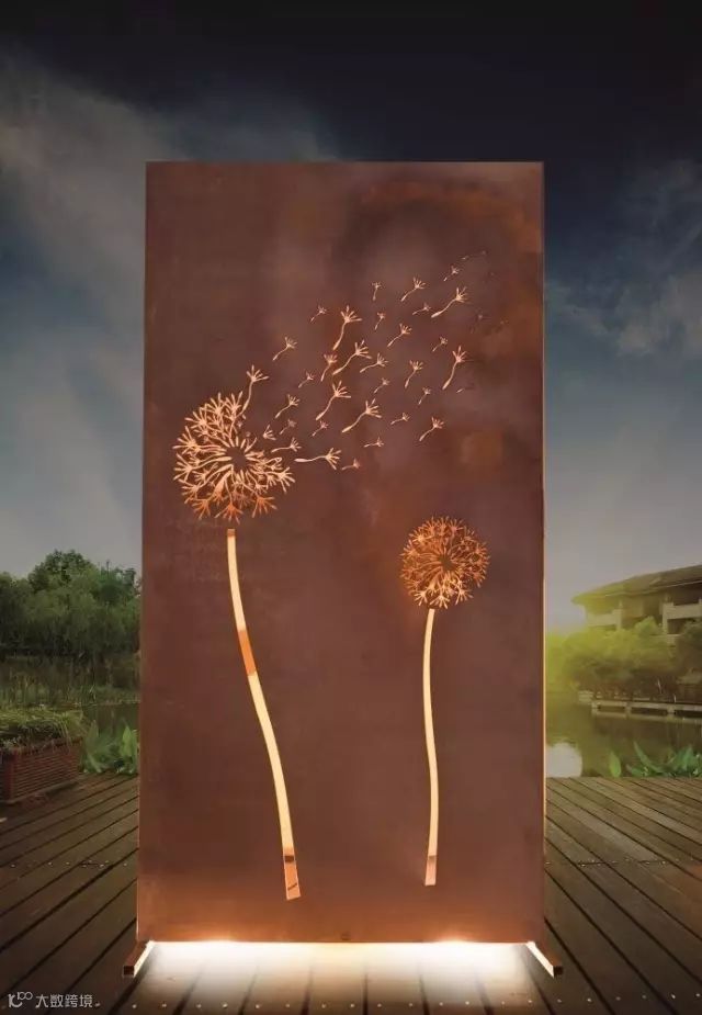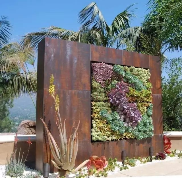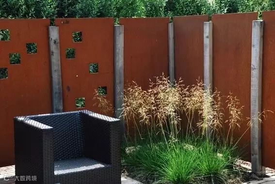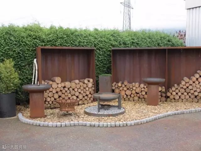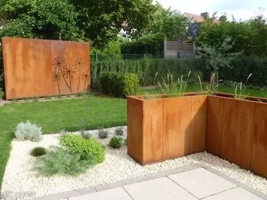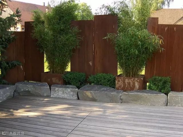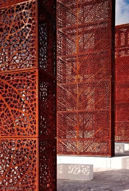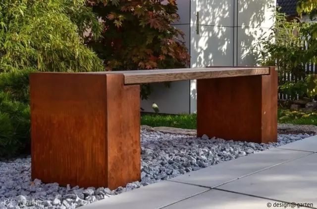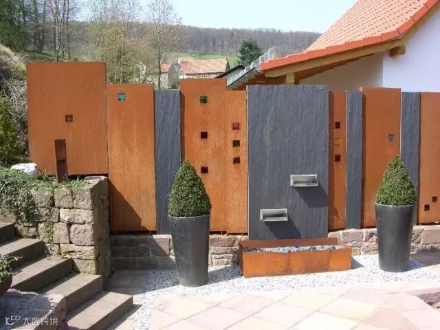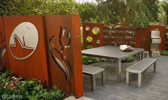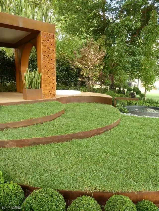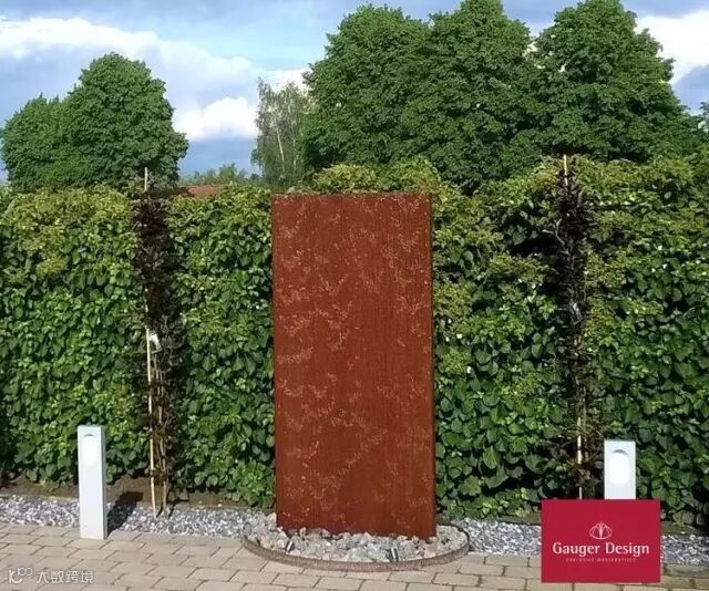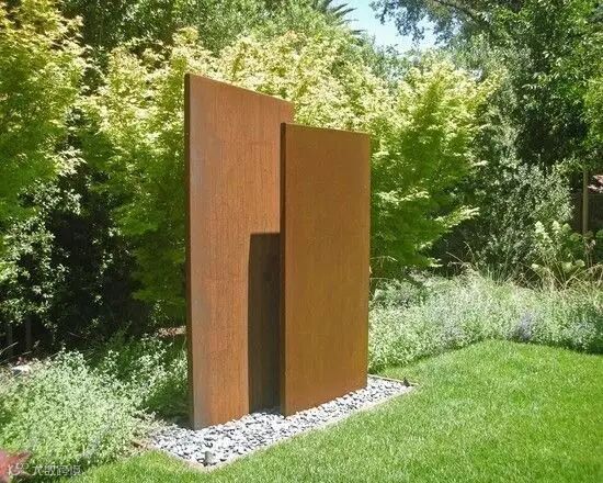 1.它具有突出的视觉表现力。锈蚀钢板会随着时间而发生变化。其色彩明度和饱和度比一般的构筑物材料要高,因此在园林绿植背景下容易突显出来。此外,钢板锈蚀产生的粗糙表面使其构筑物更富体积感和质量感。