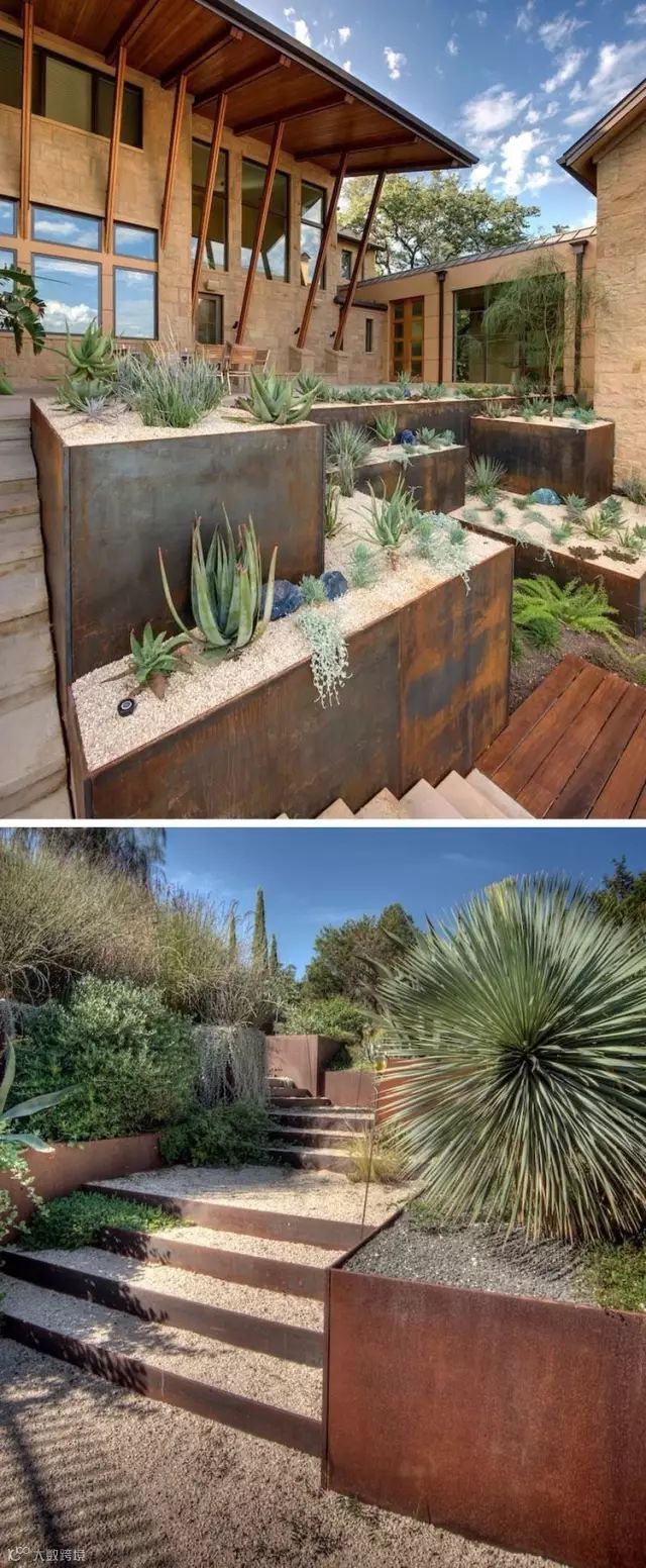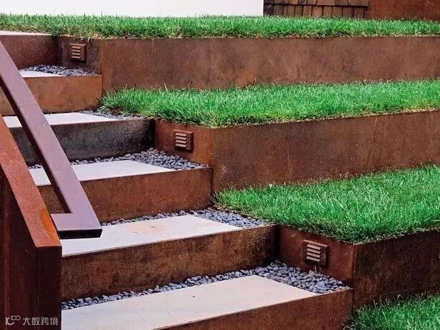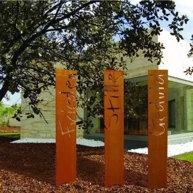耐候钢除了应用于,建筑结构和建筑外立面,在景观建筑、挡墙、景观桥,台阶、雕塑、引导标识、种植池,及其他景观小品等的应用中都能看见它的身影。