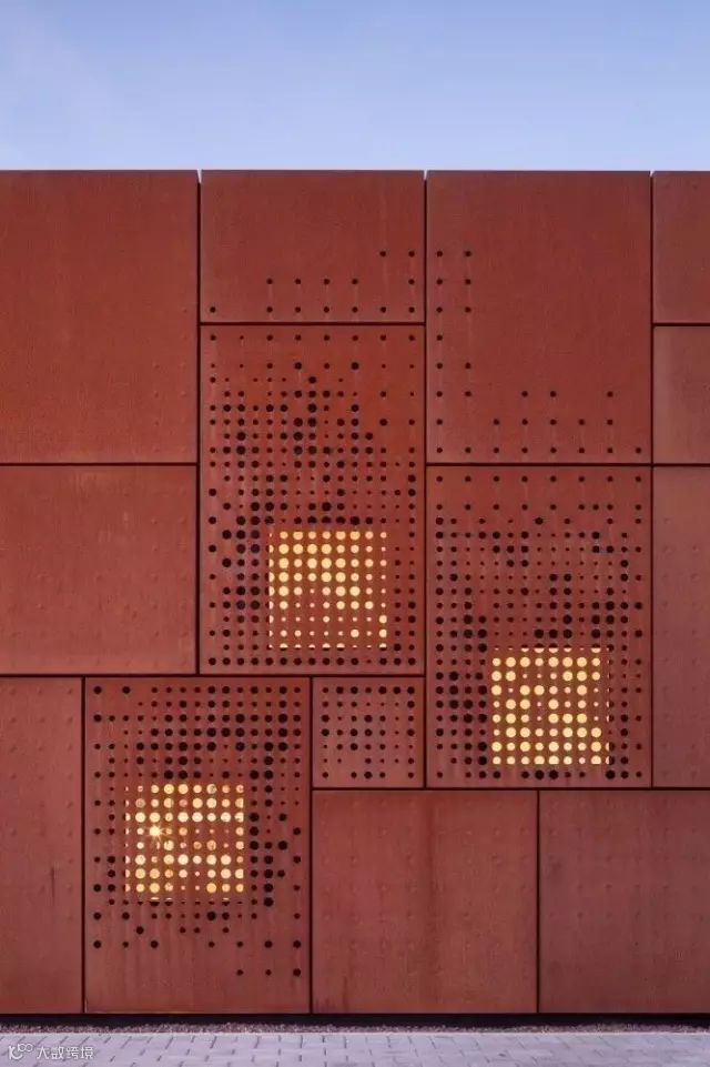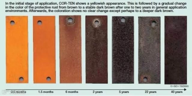 耐候钢最早起源于北美,作为建筑立面材料使用在北美、西欧、澳洲及亚洲的日本、韩国都有一定历史。耐候钢板可作为立面材料使用的主要技术支撑点是锈钢板与普通耐候钢材相比其耐腐蚀性超强。在自然气候下,锈钢板通过加入铬、铌、钼、镍、钛、稀土等耐候性合金元素,使钢铁材料在锈层和基体之间形成一层约50-100微米厚的致密且与基体金属粘附性好的氧化物层(即锈红色)。