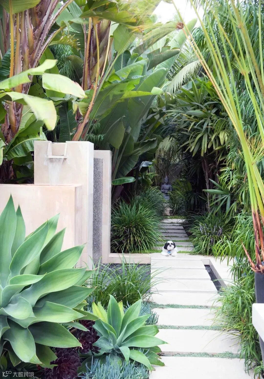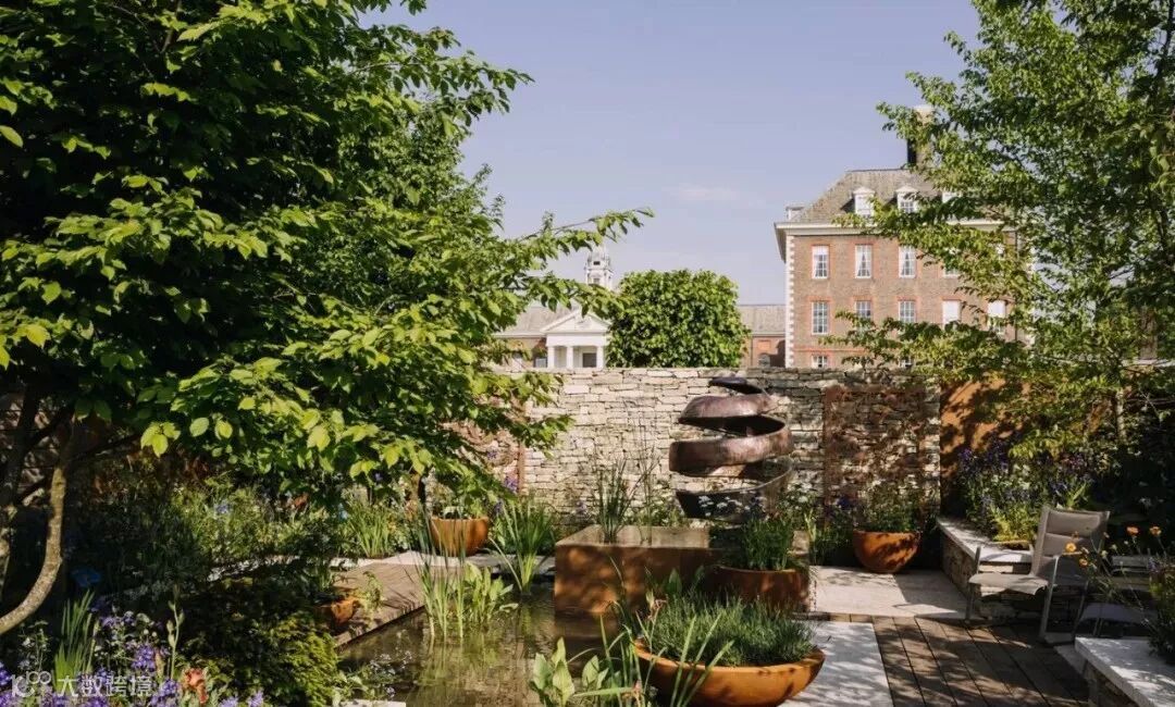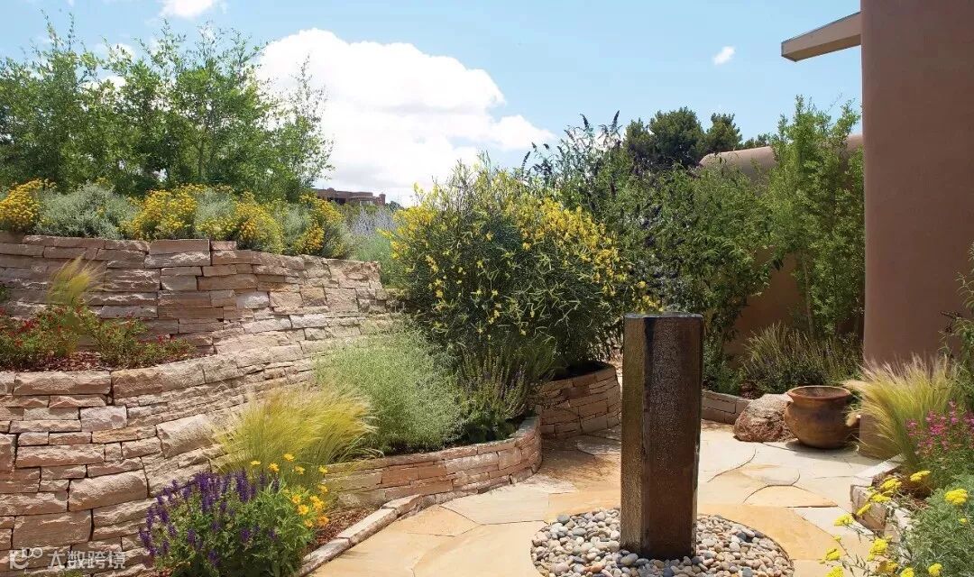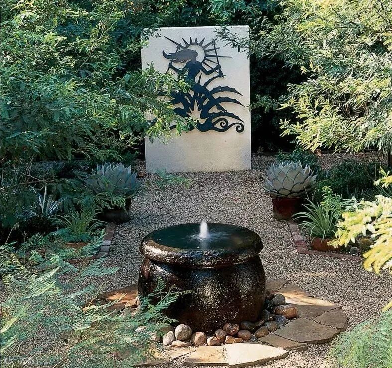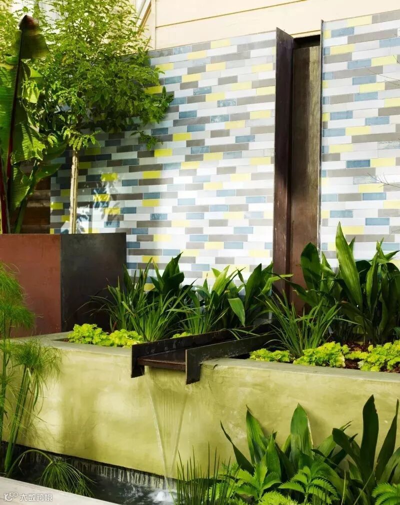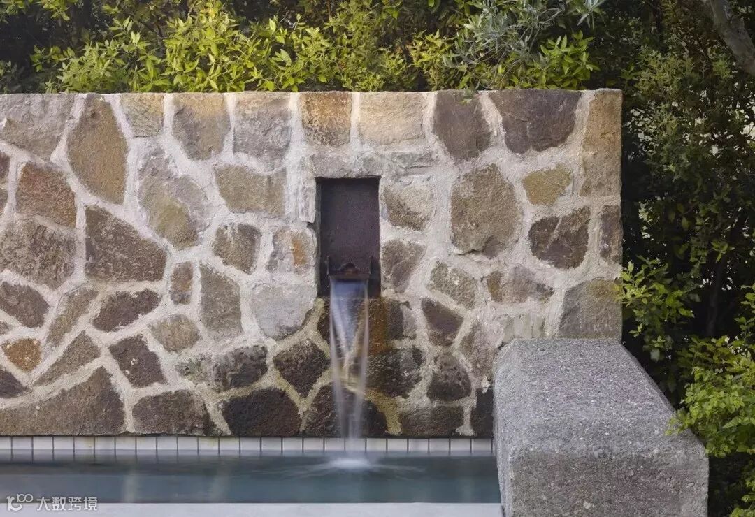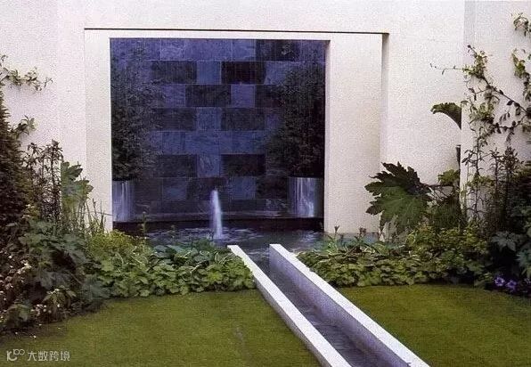 水景墙的样式选择既要与整体花园的风格搭配也要考虑到水体的流动路径,做好高差、防水、形式感这些细节的处理。比如欧式调性的水景墙通常贴米色文化石或莱姆石,线条也比较古典有造型,而现代感的水景墙则通常把水的动感融入造型之中,使其沿着规矩的流线自由向下。